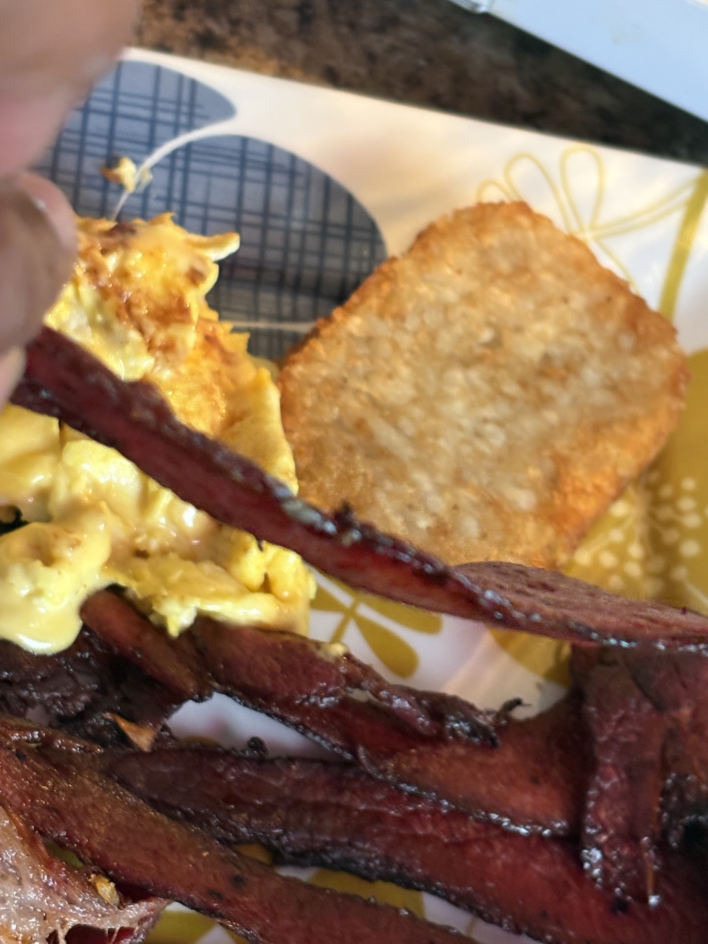 I’ve been here some years ago . It was a very pleasant experience . This morning around 8:30 I entered this establishment. It was clean and welcoming, there was only one person eating inside . The server Kerstin (apologies if I spelled it wrong) immediately greeted my wife and I and gave us two menus. As I began to order she assisted me and told me to order the combo instead of ordering everything separately. Fast forward: Food comes out in a brown bag, we pay and leave . Now normally I would check my food on the spot but I was so tired and had the bare minimum of energy. I get home and had to change the food from the container that it was served in , my food was thrown on top of each other, the eggs were Brown, hash browns tasted like Grease and was very soggy, now to this the beef bacon . I’ve never seen or been served what tastes like plastic beef bacon . It was very hard, dry and stiff. My coffee was burnt like burnt coffee beans. I was highly disappointed and disgusted that not only would they serve someone food like that, but the amount love and effort put into my breakfast was very slim to none ! I will not...