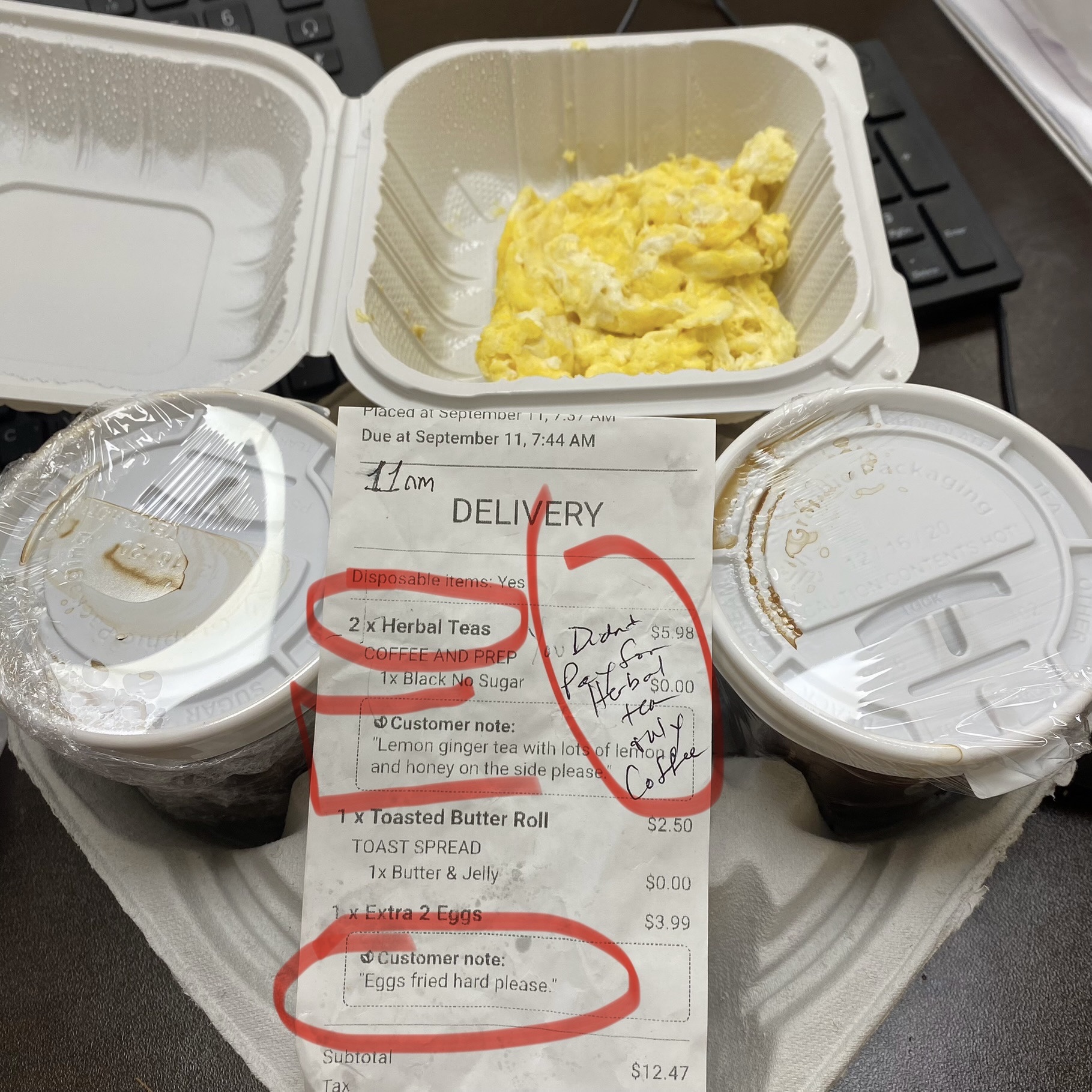 SEE SCREENSHOTS: I have ordered the same items b4 on DoorDash & UberEats w/ NO issue but now suddenly i “don’t know how to use the apps” and “selected coffee so i got coffee”??? Is it me who’s incompetent or is it the person preparing my order??? The lady admitted she never used Uber Eats and doesn’t know what the menu says, but somehow is accusing ME of being incompetent and “doing the wrong thing”?? No accountability whatsoever. Even when i tried to teach her about the app she refused to listen and kept yelling & accusing ME of incompetence. This is a GROWN middle aged woman acting like this. The app REQUIRES you to make a coffee AND PREPARATION selection. That doesn’t mean i’m asking for coffee. I selected “Herbal Tea” as listed on their menu. I selected to have my tea with no cream and no sugar, I politely asked for everything on the side as you can see in the order notes like i always do. How is it me that’s being accused of incompetence and getting yelled at over their mistake??? I have ordered the exact same thing in the past as you can see from the picture and got NO ISSUES getting tea if i order tea. I was told “you can’t get herbal tea at that price only coffee, you ordered coffee”. Then why does your menu say HERBAL TEA?? And how have i gotten herbal tea at that price SEVERAL times before??? I put a screenshot for proof! I even asked “okay if you can’t get herbal tea by selecting herbal tea… how else am I supposed to order it??” The lady had no idea, accused me of incompetence, and yelled at me repeatedly for trying to explain that she was making a mistake. They have a “large tea” option on their menu, but I didn’t want large. I selected what i did because it comes as a SMALL HERBAL TEA, i know because I’ve ordered that same thing several times before. Is she new there??? She also didn’t even address the improper preparation of the eggs i ordered being too busy yelling at me over tea. TEA! It’s not even about money, Uber already issued the refund. I was going to reorder and give the money right back but not after this. Obviously the only difference this time was the person who prepared my order. She needs to go.