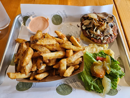 The food was excellent. The veggie burger was crispy and flavourful. The lettuce, onion, pickled peppers and grilled mushrooms I got were fresh and the buns were soft. I can't say how the Philly burger was but my friend raved about it and said it was the best burger he's ever had for under 15 dollars. Fries were also fantastic. Their m2o fry batter has garlic and sea salt in it which makes it taste fantastic and it's crispy to boot which is my favourite kind of fries.