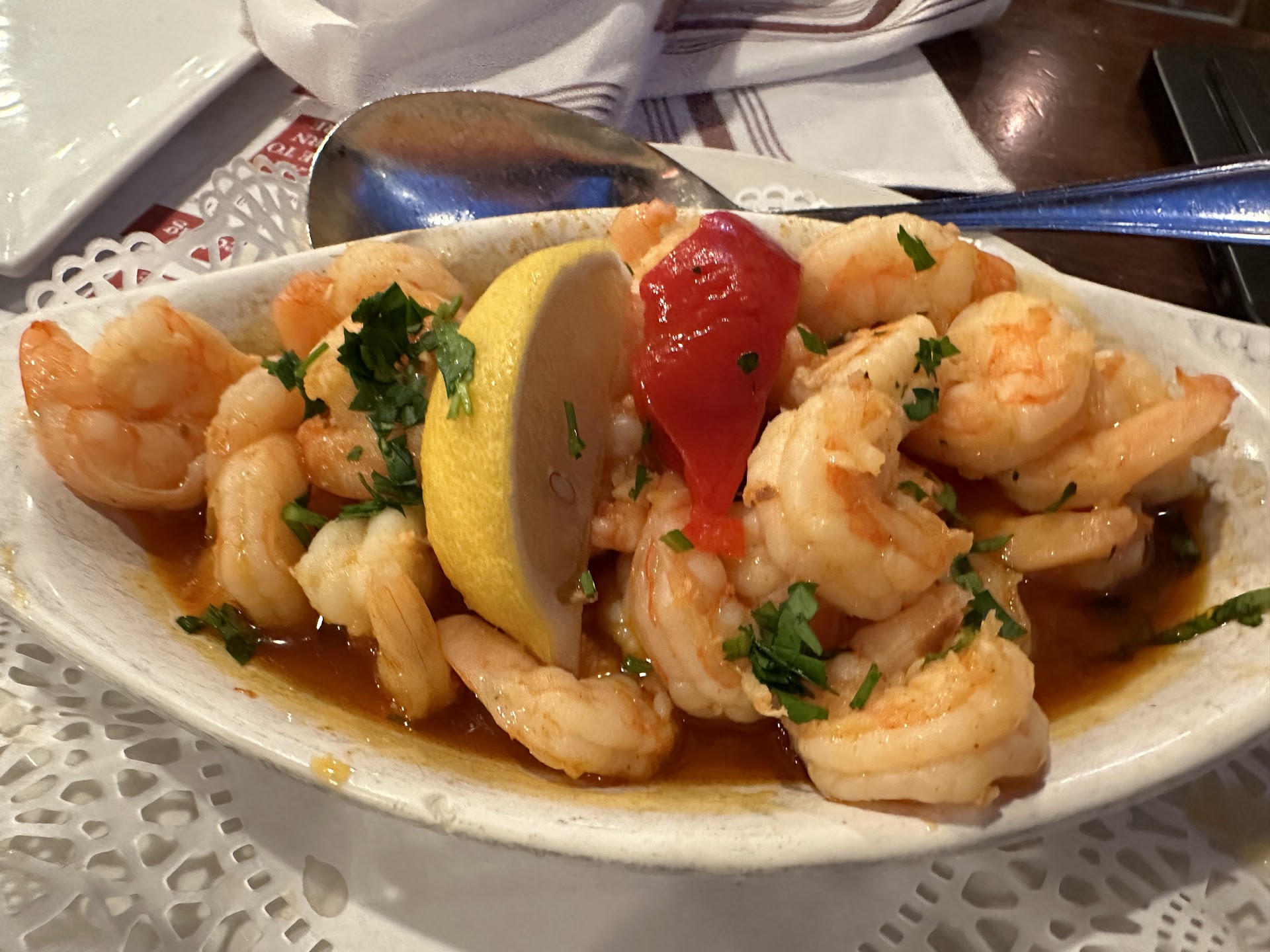 The table had Halibut in a sauce served with boiled potatoes and broccoli robe. The main attraction was the seafood plate of steam lobster, logostino, grilled shrimp, clams, mussels, calamari and more. This fed four.