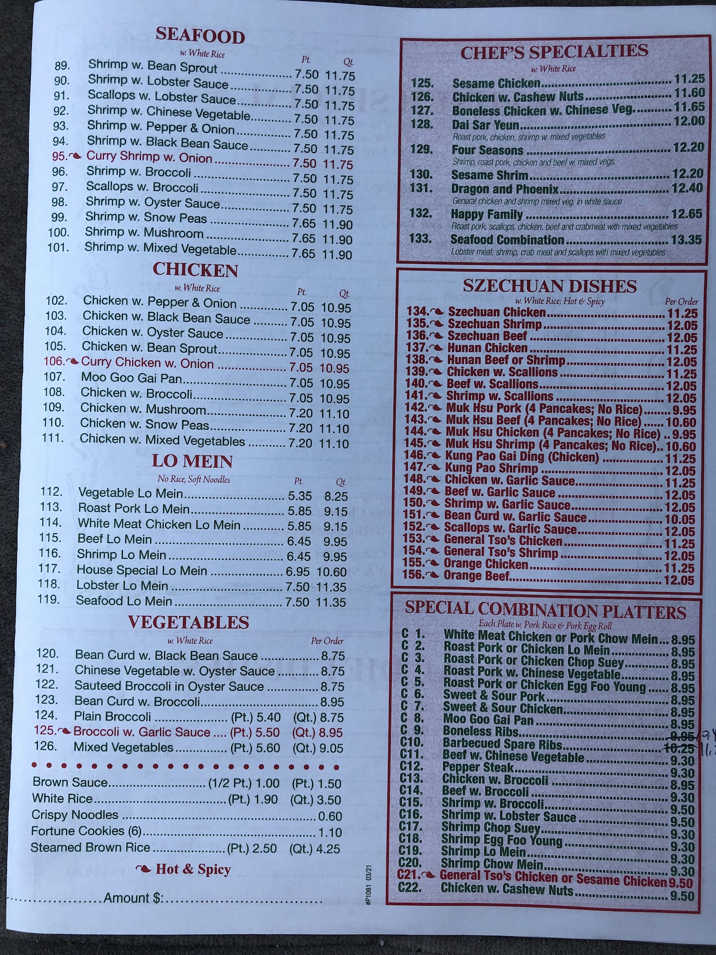 I had two orders. One order was chicken egg foo yung, the other chicken wings and beef fried rice. The chicken wings and beef fried rice were fine. However, the chicken egg foo yung was horrible. The patties were burnt and the gravy had absolutely no flavor. I even ordered a larger white rice. I spent a good amount of money for these orders. When I wanted to return the chicken egg foo yung because it was burnt and get something else, I was told that I had to pay half price for that order. Even though they seen that the egg foo yung was barely touched (and took it back also) they still charged me half price for another order. This is not good customer service at all. This is not a place that I plan on patronizing ever again, and neither will any one of my coworkers who often patronize this place as well. Lord only knows what they did with the food that they took back from meâŚâŚâŚâŚbad...