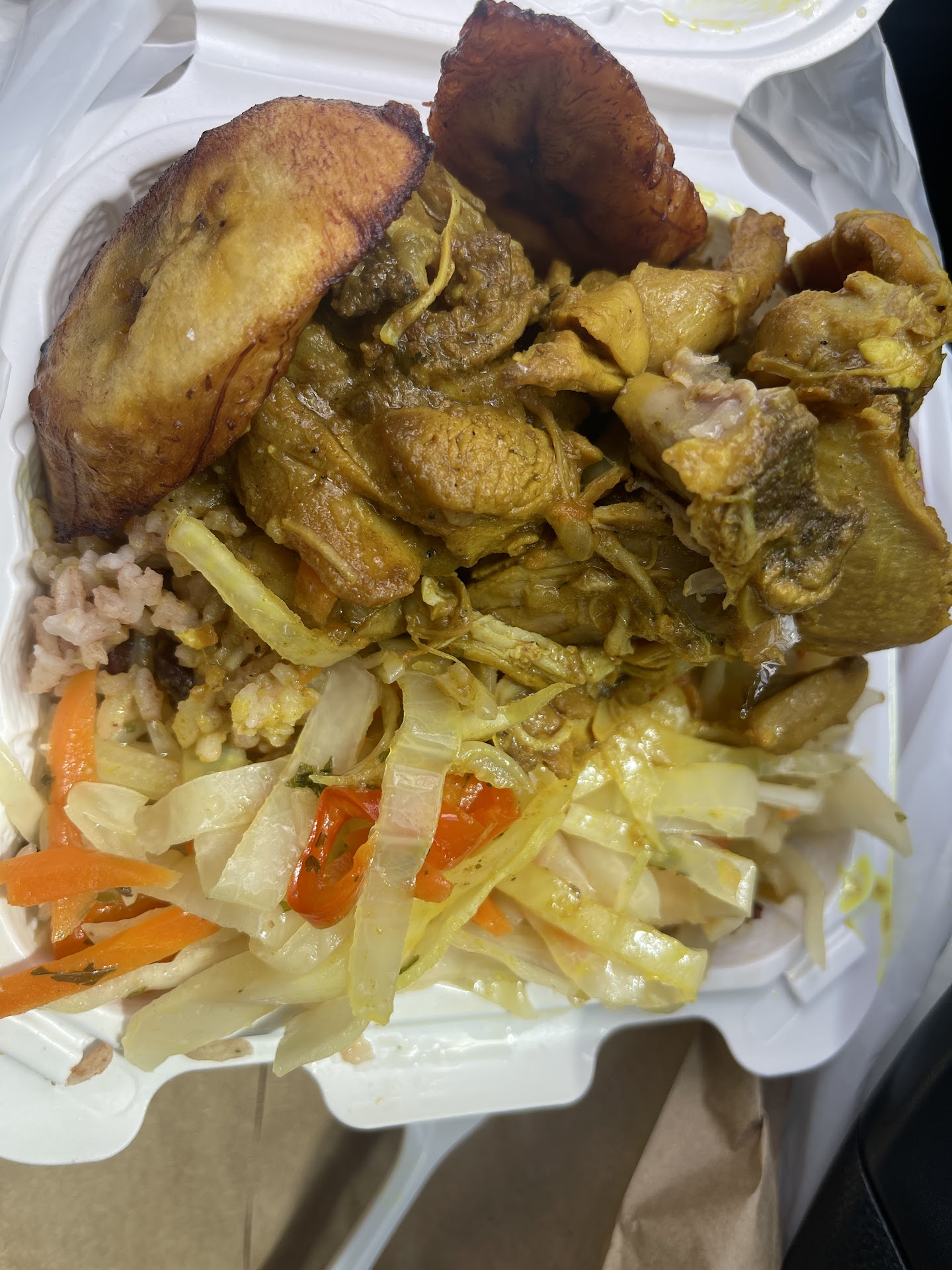 First of all (Doing my happy dance-while eating) it doesn’t make no sense how ON POINT my food is right now. Grant it this is my first time eating at this restaurant (at work and needed something to eat and it was across the street) but this cabbage and carrots (has a light sweet-spice) taste like gold. Rice and peas are cooked to purrrrrrfection!!!!!! Lets talk about the Curry Chicken 🍗 (BABY) I normally do not eat curry chicken because it’s messy and it never speaks to my stomach and soul but FINALLY “I’M IN L❤️VE.” New customer for the life of your store front (Right here). Let me finish eating my food.