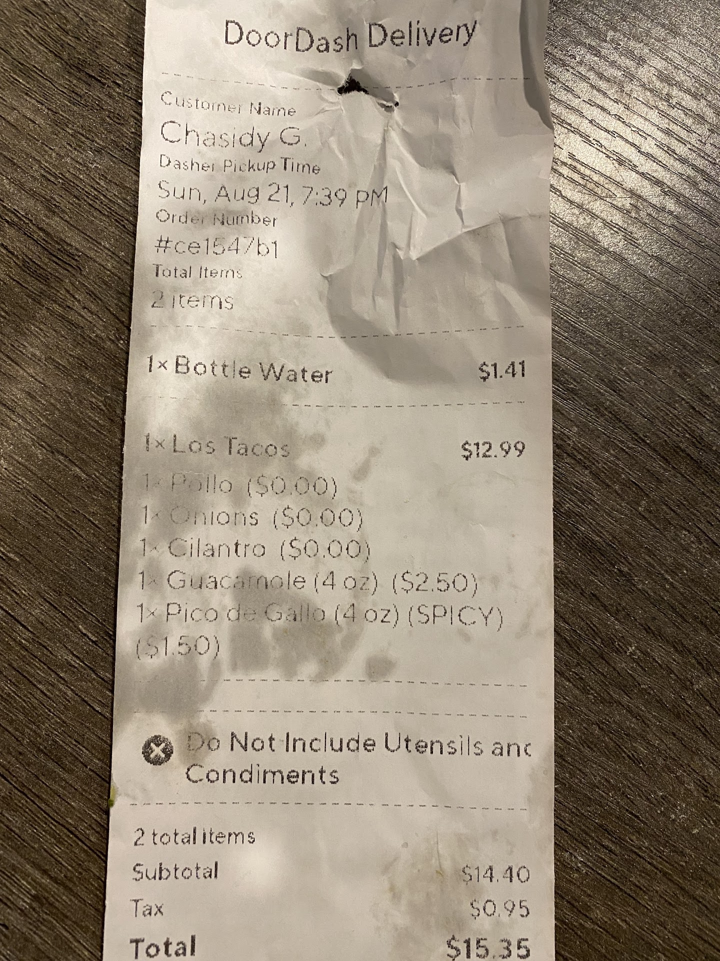 I ordered thru DoorDash four PAID items: The los tacos which was $8.99, the guacamole which was $2.50, the pico de gallo which was $1.50, and a bottle of water which was $1.41