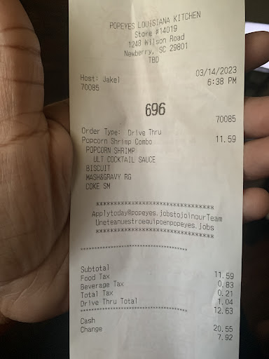 Read moreAvoid this store. Ordered an 8pc Family pk all dark (2/10). Cook in back was in a terrible mood and after several minutes announced they only do all white or all dark for 2pc, 3pc meals, not family. "Family meals are a whole chicken, we don't do all dark or white". Got to say that's the first time ANY chicken store has said that (KFC, Bojangles, Zaxby's, or other Popeyes, etc). The girl at the counter Tywanda tried to fill the order but grouchy cook in the back wasn't have'n it. Go to Bojangles, Zaxby's, or the Popeyes in Greenwood instead. 1-star rating for grouchy cook and the fact that an all dark and mashed potatoes with gravy on the side can't be done. Follow-up: The (new) manager at this Popeyes store called me the next morning and expressed her apologies for my bad experience and offered to replace the 8pc dark mashed potatoes with gravy on the side. I stopped back in Sunday (2/12) and she presented me with an 8pc all dark, Lg mashed potato with gravy on the side and biscuits no charge. Thank you new manager. Moral of the story: As a customer, it is always beneficial to stay calm and be hospitable. Mistakes can be made and food service workers can be grouchy. Fill out the survey on the back of the receipt or call and complain (or as to see the manager right then and there. 4-stars for new manager and her very...