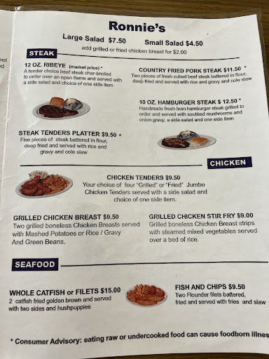 Read moreRonnie's has a buffet set up in the restaurant when i went on Sunday. You let the server know what you would like and they prepare the plate for you. I had the 4 vegetable plate. The dressing was delicious. I also had the mac and cheese that was tasty. The noodles were over cooked though. I also had cabbage as one of my veggies. No taste or flavor what so ever. Tasted as if I was eating water. They need to add something to the cabbage to give it some flavor. The cream corn was rather thick but not bad. I'll give it another try being this is about the only place to get southern cooking or Comfort food on Sunday...
