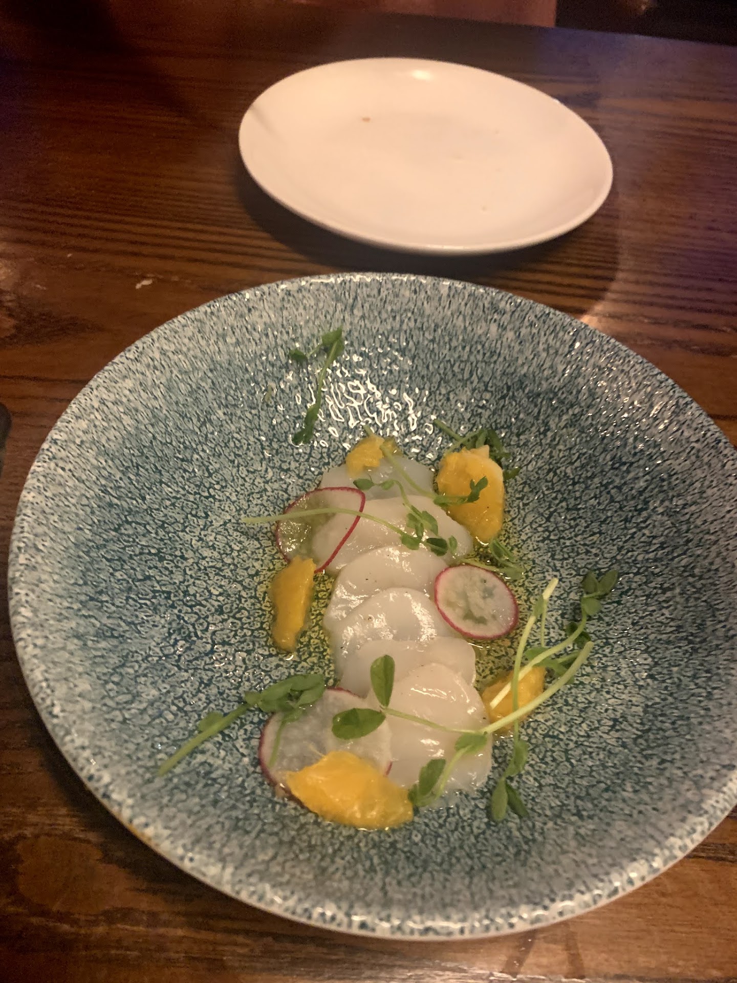 Prior to the meal, we decided to try the daily 'crudo' which she said was scallop ceviche. (see photo) We've had seafood ceviche many times, and let me tell you, this was not ceviche. What we got was ONE scallop sliced into about 5 thin slices.... Yes, ONE SCALLOP for $15+ ... and it was sliced up on the plate basically sitting in a puddle of olive oil with a tiny bit of garnish. We tried it and it was terrible. I am not picky and I can't think of another time we've done this, but we actually asked the server later in the evening to take it off the bill and since we only took a few bites and decided it was not worth eating. Ceviche is normally strong citrus flavor with maybe some herbs, and NO olive oil. The scallop ceviche here literally just tasted like a plain scallop in olive oil and was not good.