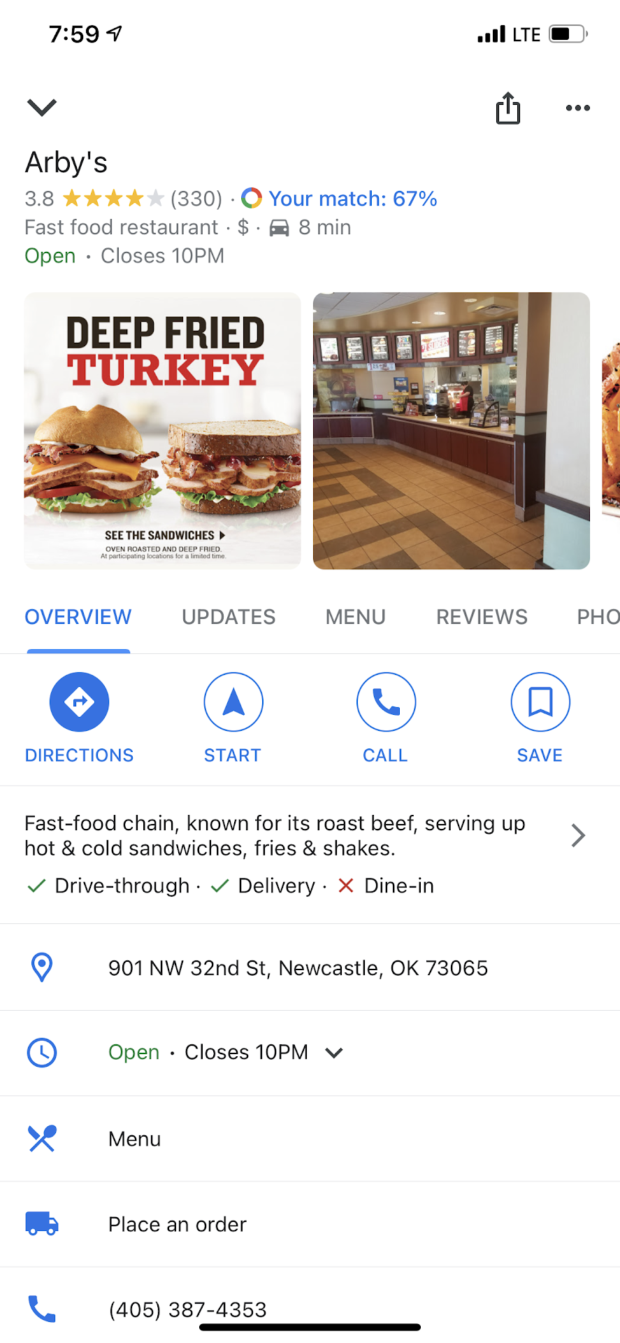 Read moreI stoped for lunch at the arbys in tricity on my way to a customers house the service truck i drive will not fit in any drive through, i found the lobby door locked so i politly knocked on the window after i knoticed an employee sitting at one of the tables the employe informed the manager that i was at the door. A moment later the manager comes to the door and opened the door and leaned through the opening keeping to door closed as much as possible. I then explaned thay my work van will not fit in the drive through i aske kindly if i may order in the lobby. The manager then stated that i had to stand in the drive through line. I politly asked "are you serious "because it caught me off gaurd that she would not offer to take my order while i wated outside. I would have been understanding of that. but that must not have been an option eather the manager of the arbys then stated that they would get in truble if they let anyone in so i kindly said that ill walk across the street and have lunch at sonic. I go to the arbys in okc at lease 2 times a month and there lobbys are open im able to order without any issue in the city. I will no longer give my business to arbys because of this hypocrisy, You may think that its over board to completly stop patronizing a business for something as small as this but if your not going to accommodate your customer and then ask a customer to walk through the drive throug than you do not have the customers safty in mind and you do not want to earn the loyalty of customers. I will let all my friends and family know that arbys did not earm...