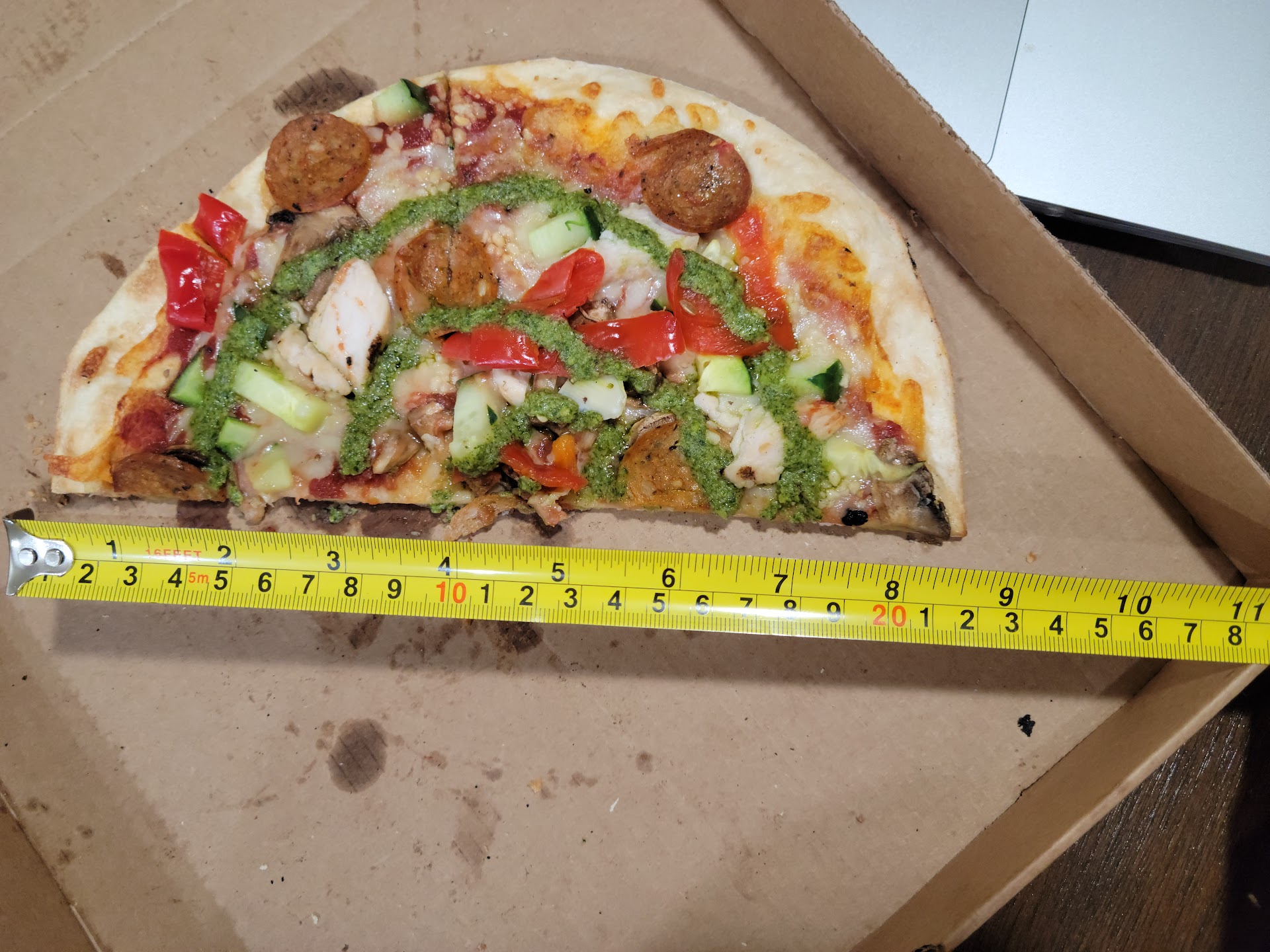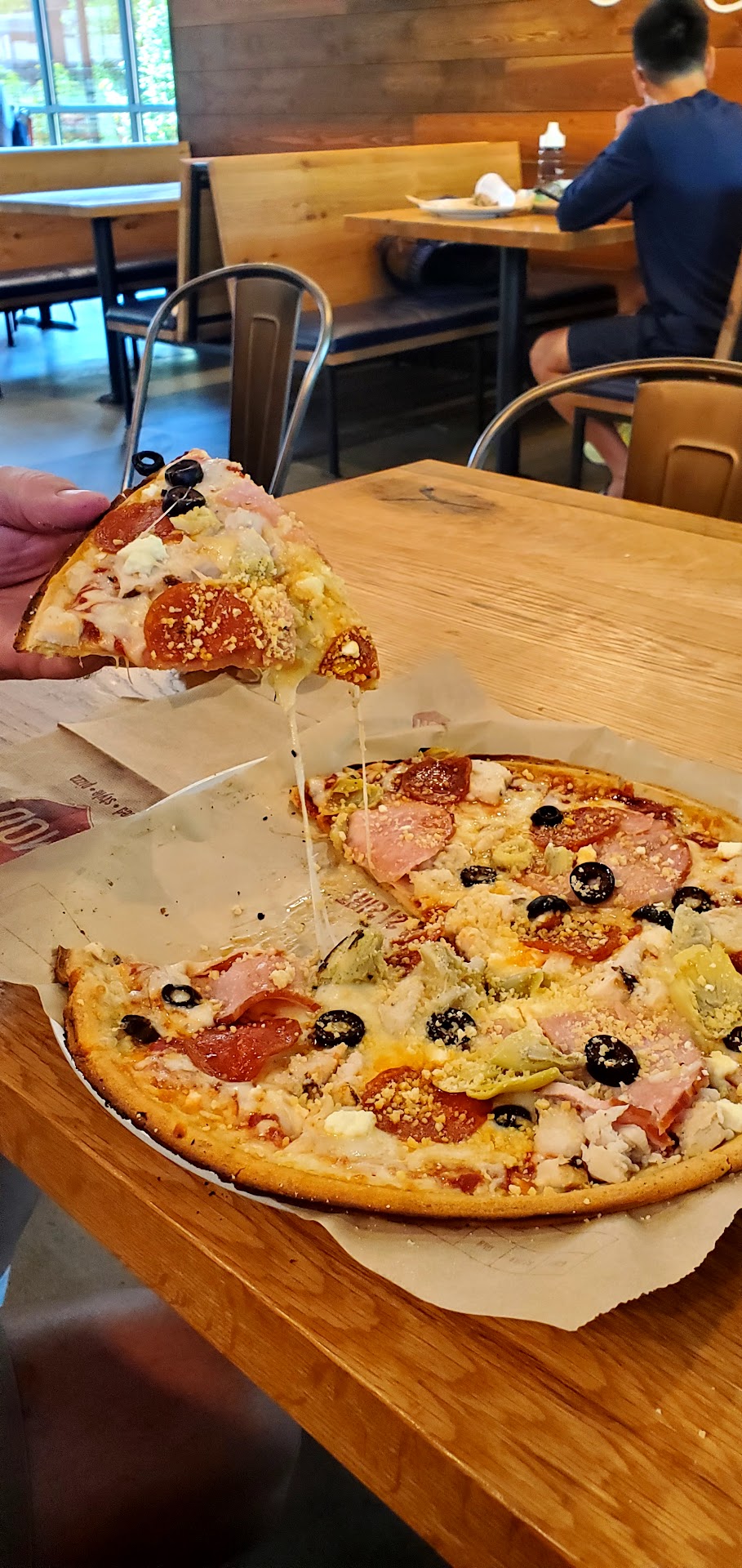 Unfortunately they got my order wrong and I didn't realize it until I got my pizza. I'd ordered the extra thick pizza dough, and the paper under my pizza said it was supposed to be that, but it wasn't - thankfully I wasn't charged for the thick dough. I find the thin crust pizza a little less filling, so I wish they'd given me what I asked for. The other issue is that the restaurant was SO VERY COLD! 🥶 For some odd reason, even though it was only 61F outside, they decided to turn on the air conditioning. It was very uncomfortable and made our pizzas cool down even quicker than normal. Restaurants should only turn on the AC when really needed.