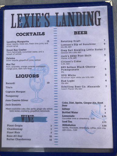 Read moreAfter having been to Lexies, I thought that Lexie's Landing would be equally pleasing. Unfortunately, that was not the case. We called Lexie's in Portsmouth to see if there was outdoor seating, as we had just left the vet and had our dog with us. The girl that answered the phone said no, but dogs are allowed at their other location, Lexie's Landing. She also assured me that the menu was the same and that their great burgers are all available at the Landing. Unfortunately this was not so. There are three burger choices on the menu and two on special, with not much variation. The onion rings that were so delicious at Lexie's are not available at the Landing. The dog was not allowed in the outdoor seating and there was a sign for "service dogs only" at the door. Not a good experience. The burgers that we did order had avocado on them - 3 tiny slivers that covered 1/4 to 1/3 of the buger. The burger taste was mediocre at best. Nothing like what we had previously at Lexi's. The waitress forgot to bring out two of our three orders of fries. She ended up comping them when we asked where they were. Our overall experience was poor and we...
