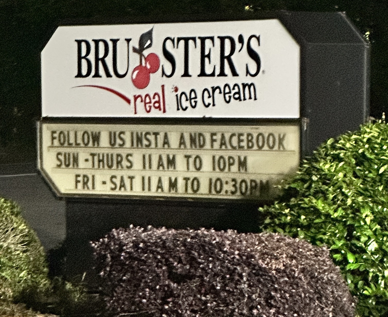 Read moreThe quality of the ice cream that myself & 3 other family members that was with me received was great!! A++ However, we arrived at 9:35 PM on a Sunday night May 21, 2023 to buy ice cream. This Brusters Ice Cream location’s operating hours are ONLY posted clearly on a lighted sign on the side of the road beginning at 11 AM until 10 PM. Arriving at 9:35 PM, the employee that waited on myself & other family members stated “we are out of vanilla flavored ice cream!!” That’s the most common flavor!! Then she said “Because we are about to close, you can only get your ice cream in a cup. You can no longer choose a cone.” If the business is going to be open until 10 PM, and it was about 20 minutes before they closed to the public, you should offer everything on the menu until that time. I will NOT be returning to...