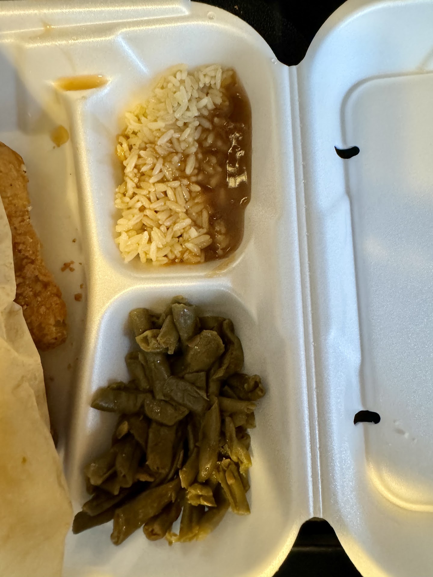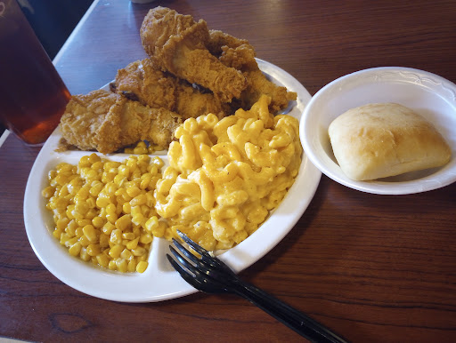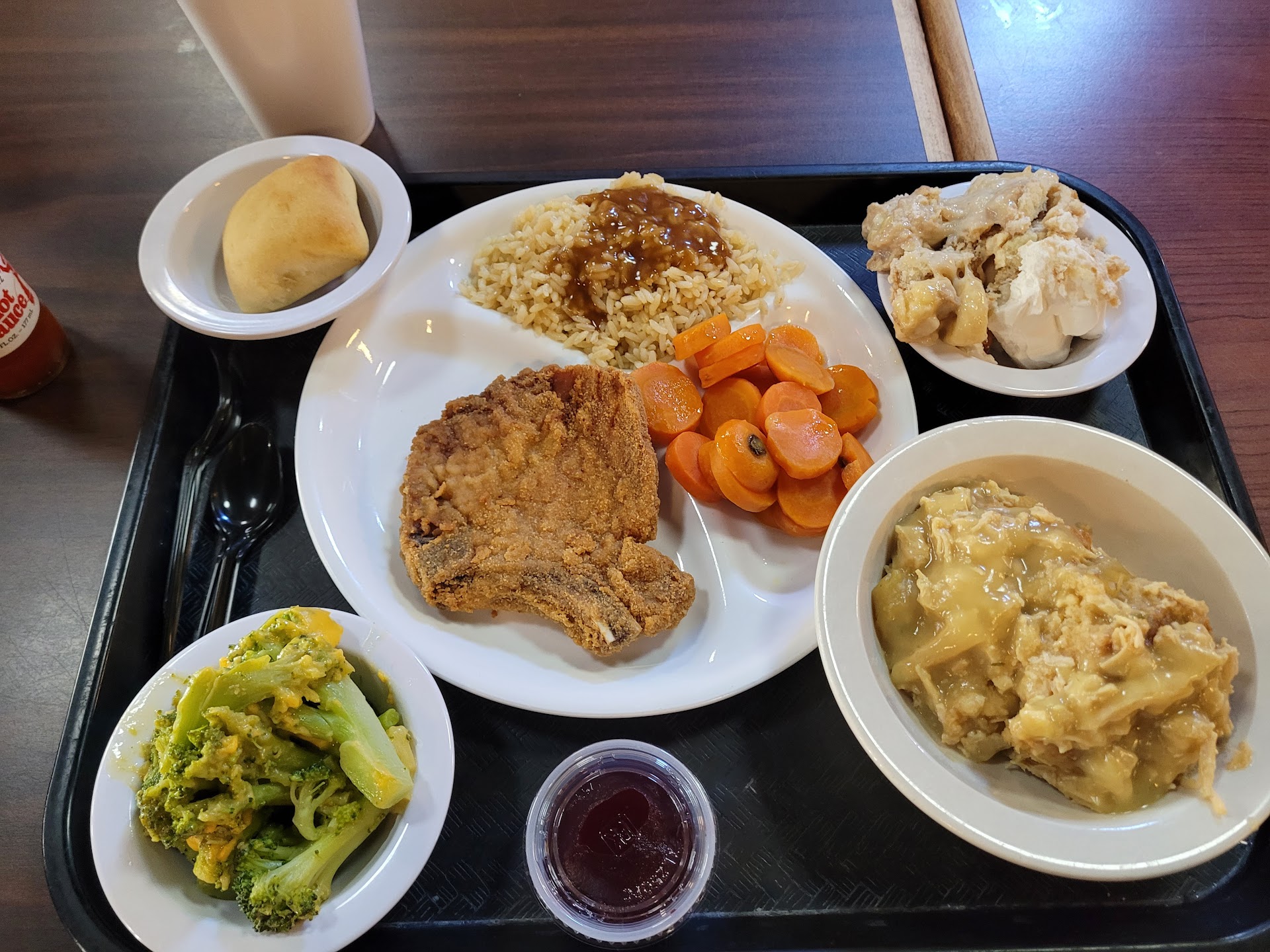 Their staples are fried chicken, meatloaf, fried catfish or some other fish, or turkey and dressing. There may be other choices, depending on the day. Typical veggies options are green beans, creamed corn, fried okra, some sort of beans, fried green tomatoes, mashed sweet potatoes, and turnip greens. They don't use animal products in their vegetables (I asked, because I do not eat meat). Mom does, and she always likes their meat options. We always get the corn muffins instead of the rolls. The banana pudding is good for dessert options, but I am not crazy about the brownie with walnuts (it was too airy and oily). The last time I had banana pudding, it tasted like my grandmother's. Today, we had an orange pudding, which had whipped cream on top and a nice graham cracker crust. It reminded me of an orange creamsicle and was good. They have tea, water, and Coke machines.