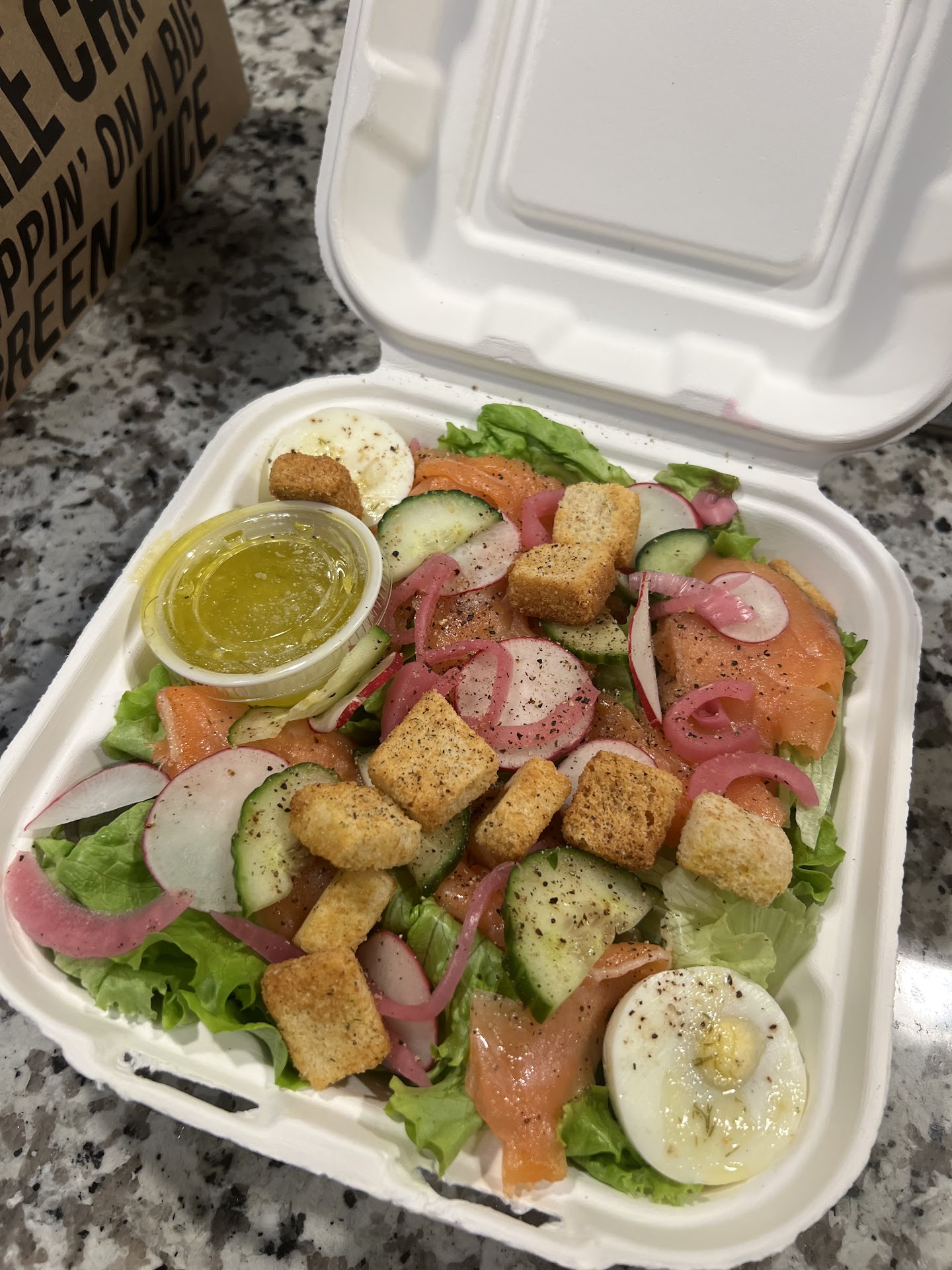 As far as the food itself, I ordered the smoked salmon salad and the grounded smoothie. I was a little skeptical about the salmon salad because I usually donāt like salmon, but the salad was soooo good! From the pickled onions to the smoked salmon on top and the mustard dill vinaigrette, I was very impressed. The lettuce was super crispy and tasted fresh. Not only was the salad aesthetically pleasing but it was delicious and healthy. Also the grounded smoothie I got was good as well and I was given a pretty good amount (I took a few sips before I snapped a picture of it, lol)
