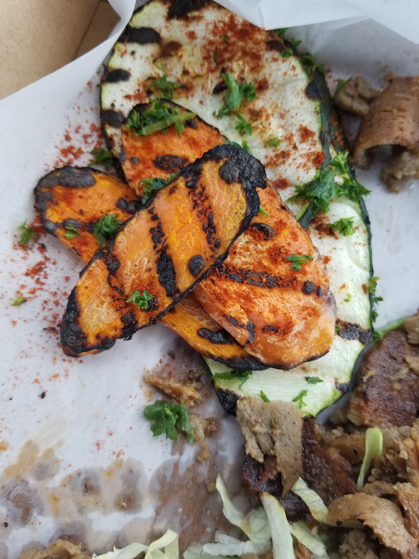 I got my order to go. As I said, I've been to Pita (varying locations) many times and have a pretty good idea of what to expect. Mouth watering and ready for the (usually) scummy, thick-sliced, perfectly grilled vegetables, I was greeted with three small pieces of carrot and one and a half pieces of zucchini. These were not the usual thick perfectly cooked slices I craved. The carrots were over cooked charred on the edges and dry--the zucchini wedges overcooked on one side, dried out on the other. I have no real complaint about the gyro meat or hummus--though I do wonder at the $1 upcharge for selecting two tablespoons of hummus as a side.