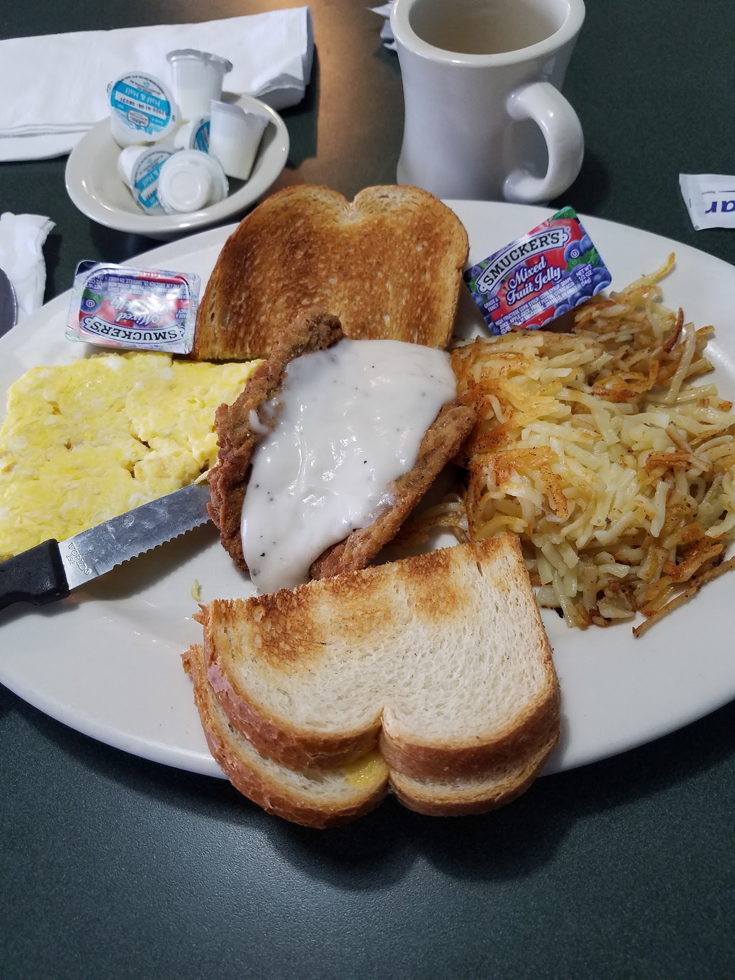 Read moreIf you're looking for a delicious southern home cooked breakfast....thus is the Place! My mom and I dropped in to this quaint local spot that's been open since 1999. Mom ordered the pancake breakfast which came with 3 giant pancakes, eggs, bacon, and home fries ( seasoned and pan fried diced potatoes) and I ordered the fried chicken tenders (4pc) and eggs which came with 4 fried tenders, eggs, a Biscuit, and home fries. I also ordered 2 Biscuits and Gravy to try. It was ALL sooo delicious. Some of the best Biscuits and Gravy I've ever had. The Biscuit alone was fluffy yet crispy and perfectly cooked in my opinion. The chicken tenders were outstanding. The home fries were a bit greasy, but to be expected. The eggs were scrambled to perfection 👌. The Best part is we got all that food for $32.50 before Tip! Incredible prices per portion. I honestly don't know whether to recommend this place or keep it my personal secret....but WOW 10/10 country breakfast...