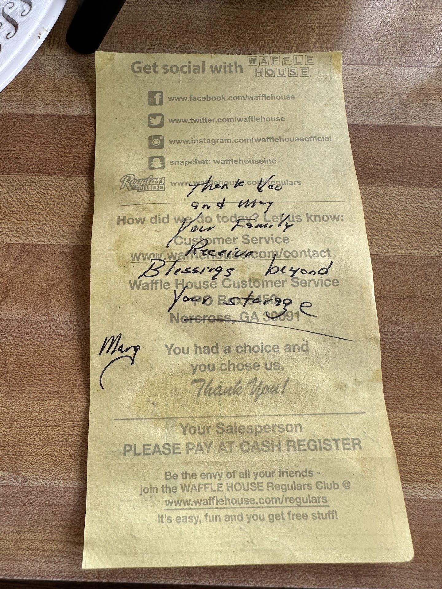 Ā Ā Ā Read moreOn a three week unplanned roadtrip in the USA coming from the Netherlands; we quickly decided that the Waffle House menu offers something for every moment. So we visited quite a few. For some strange reason the people in this last one did everything different or just plain wrong. Only one in four wore gloves while handling food en the grill operator evidently had a blind spot for kitchen planning cause he managed to serve us a plate with cold everything and the cold steak that was seriously well done although we ordered medium. The "ice cold milk" was lukewarm. While we were eating this disappointing meal at the high counter; the same grill operator started emptying trashcans full of smelly waste in bags right in front of our noses. Still not wearing gloves. I dont want these people to lose their jobs but I think a stern and serious conversation about rules, hygiene, protocol and chain uniformity may be in order. They were all very friendly and serviceminded but apparently just didn't realise the...