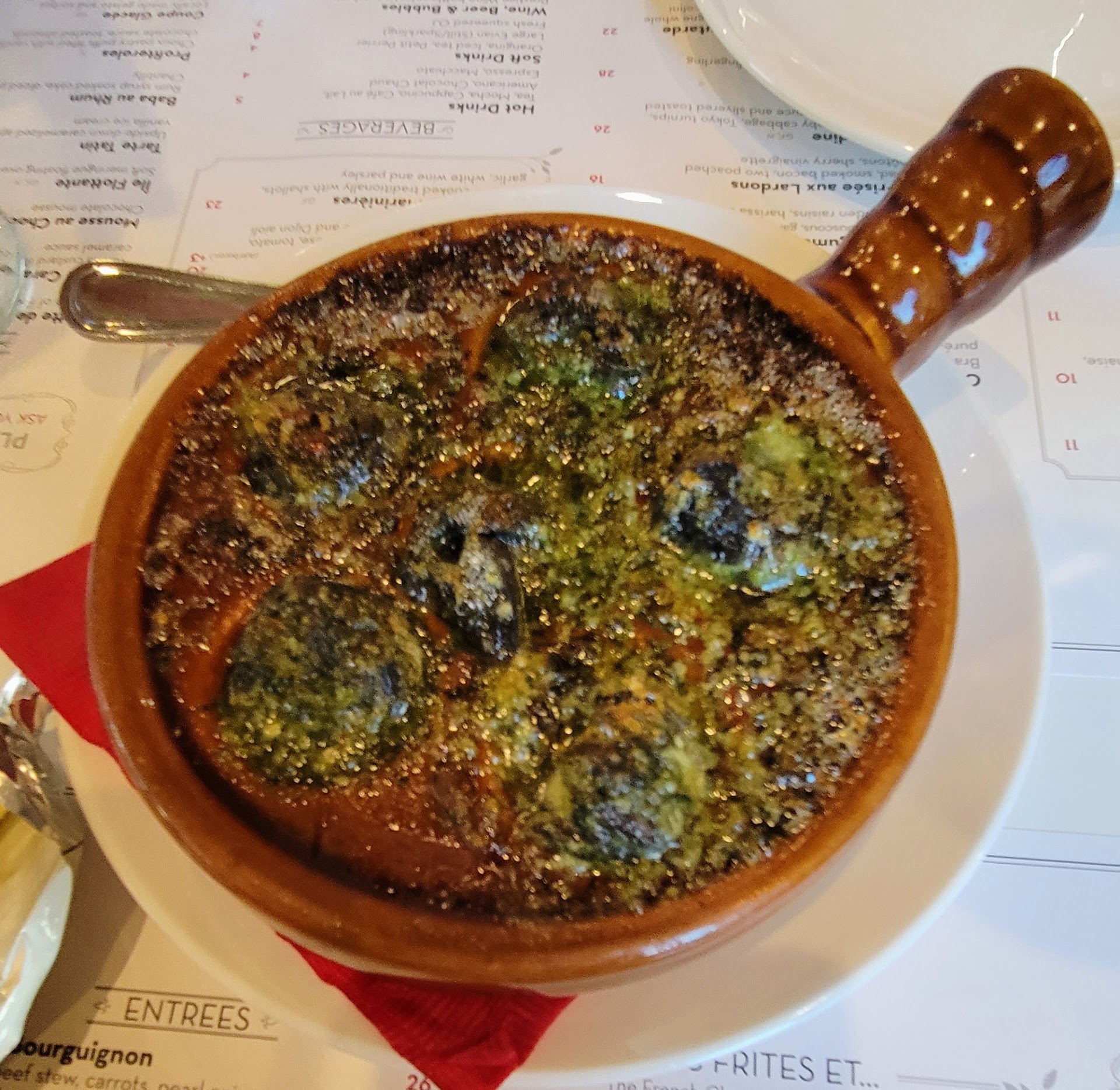 Read moreIf you have prefer a hearty meal, Bouillon is NOT for you as the main entrees are all on the lighter side in terms of the taste as well as quantity. We ordered onion soup to start, boeuf bourguignon and mussels as entree, and apple tarte as dessert. The breads are not complimentary and cost an extra $5 but I feel almost all the dish we orders needs bread to dip in. Onion soup ($15) was the highlight of the meal as it has great flavor, chewy cheese, and bread soaked with delicious soup. The only gripe I had with the soup was the portion as I would think $15 could give us a bigger bowl. We also ordered ratatouille as a side, which turns out to be an $8 mistake as it was way too salty. Boeuf bourguignon was flavorful but not too heavy, which I enjoyed but I wish I had one more piece of beef (came with 2 pieces) to justify the $25 price tag. My wife ordered the mussels, which turns out to be a dud as the mussels are tiny. The flavor was also on the lighter side as I said before. The apple tarte turned out to be a good finish at the end as it is served warm with a small scoop of ice cream on top. Overall, I am satisfied with the food and the service though I expected to be more full for $50 per...
