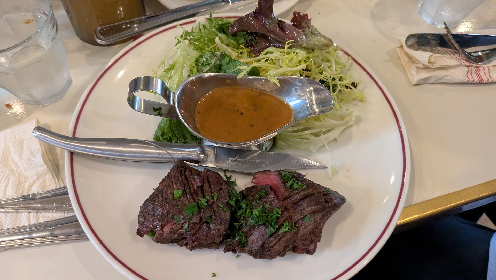 Read moreIf you have prefer a hearty meal, Bouillon is NOT for you as the main entrees are all on the lighter side in terms of the taste as well as quantity. We ordered onion soup to start, boeuf bourguignon and mussels as entree, and apple tarte as dessert. The breads are not complimentary and cost an extra $5 but I feel almost all the dish we orders needs bread to dip in. Onion soup ($15) was the highlight of the meal as it has great flavor, chewy cheese, and bread soaked with delicious soup. The only gripe I had with the soup was the portion as I would think $15 could give us a bigger bowl. We also ordered ratatouille as a side, which turns out to be an $8 mistake as it was way too salty. Boeuf bourguignon was flavorful but not too heavy, which I enjoyed but I wish I had one more piece of beef (came with 2 pieces) to justify the $25 price tag. My wife ordered the mussels, which turns out to be a dud as the mussels are tiny. The flavor was also on the lighter side as I said before. The apple tarte turned out to be a good finish at the end as it is served warm with a small scoop of ice cream on top. Overall, I am satisfied with the food and the service though I expected to be more full for $50 per...