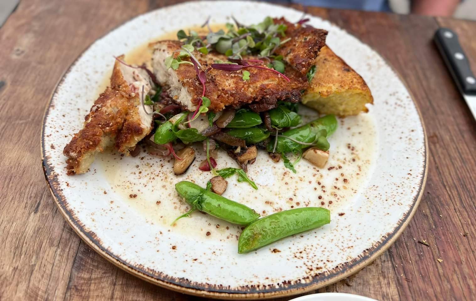 I ordered the pan-seared Panko, Dijon and Thyme crusted Autonomy Farms Chicken Pallaird.