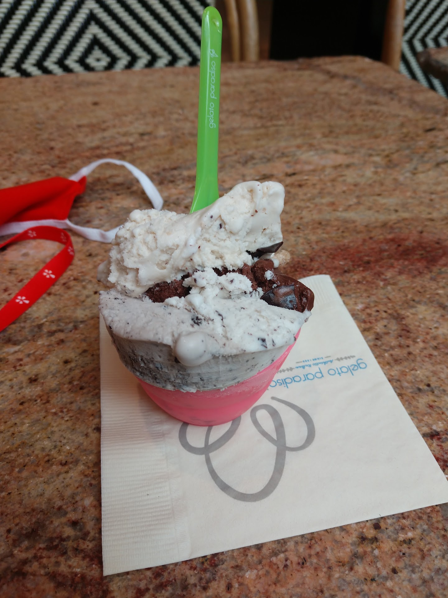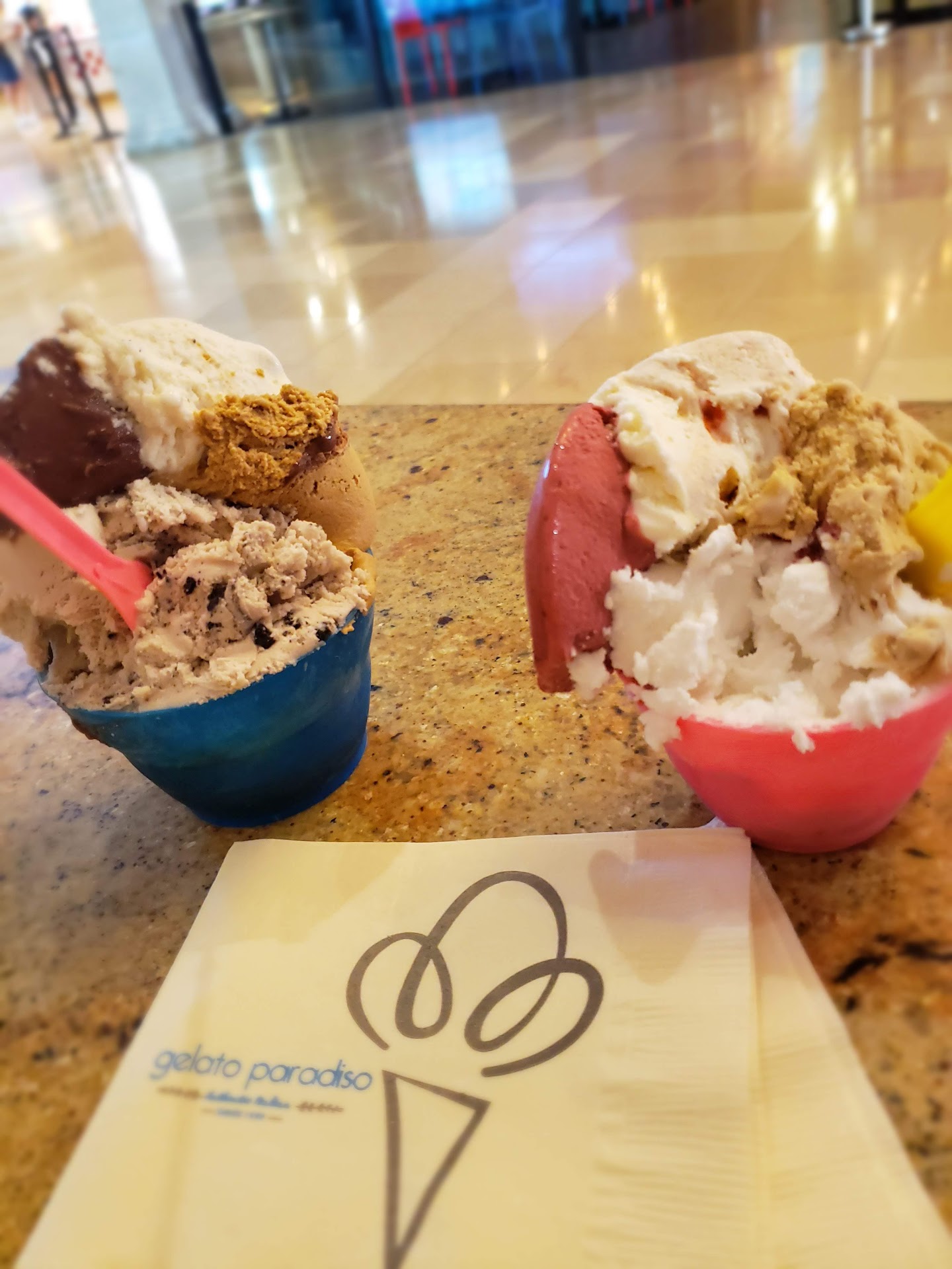 I went with the four flavor cup. My flavors were double chocolate hazelnut, chocolate chip, cookies and cream,and my bad I forgot the fourth flavor lol. The cup looks small but it's packed full of creamy goodness. The employee said the ingredients are imported from Italy. I ate in the food court but there are seats outside by the shops.