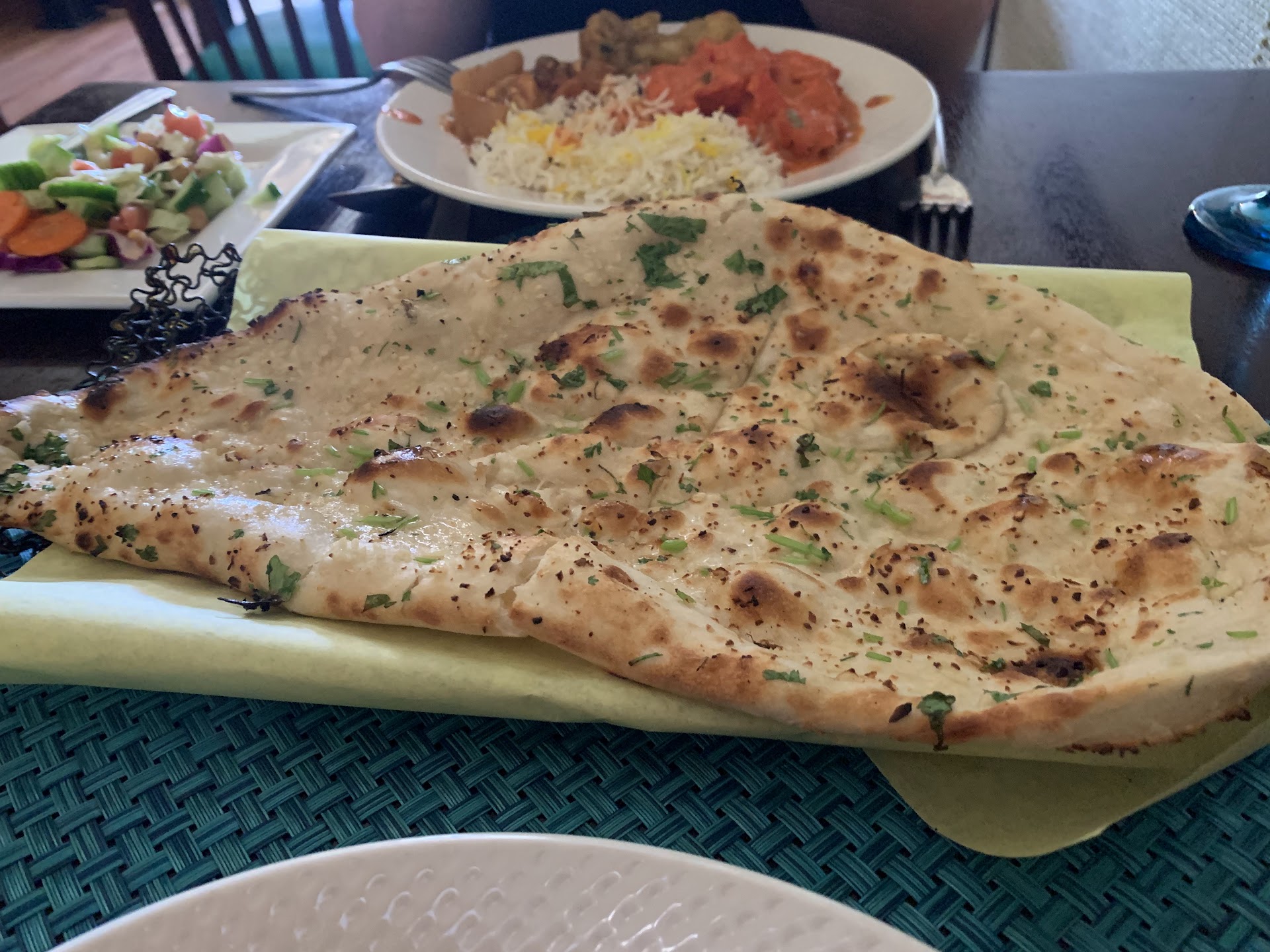 APPETIZERS Side salad and garlic naan â these were both so delicious! The salad comes with a sort of vinegar dressing (not vinaigrette) and the garlic naan is made fresh to order. Seriously, I would load up on this if I could!