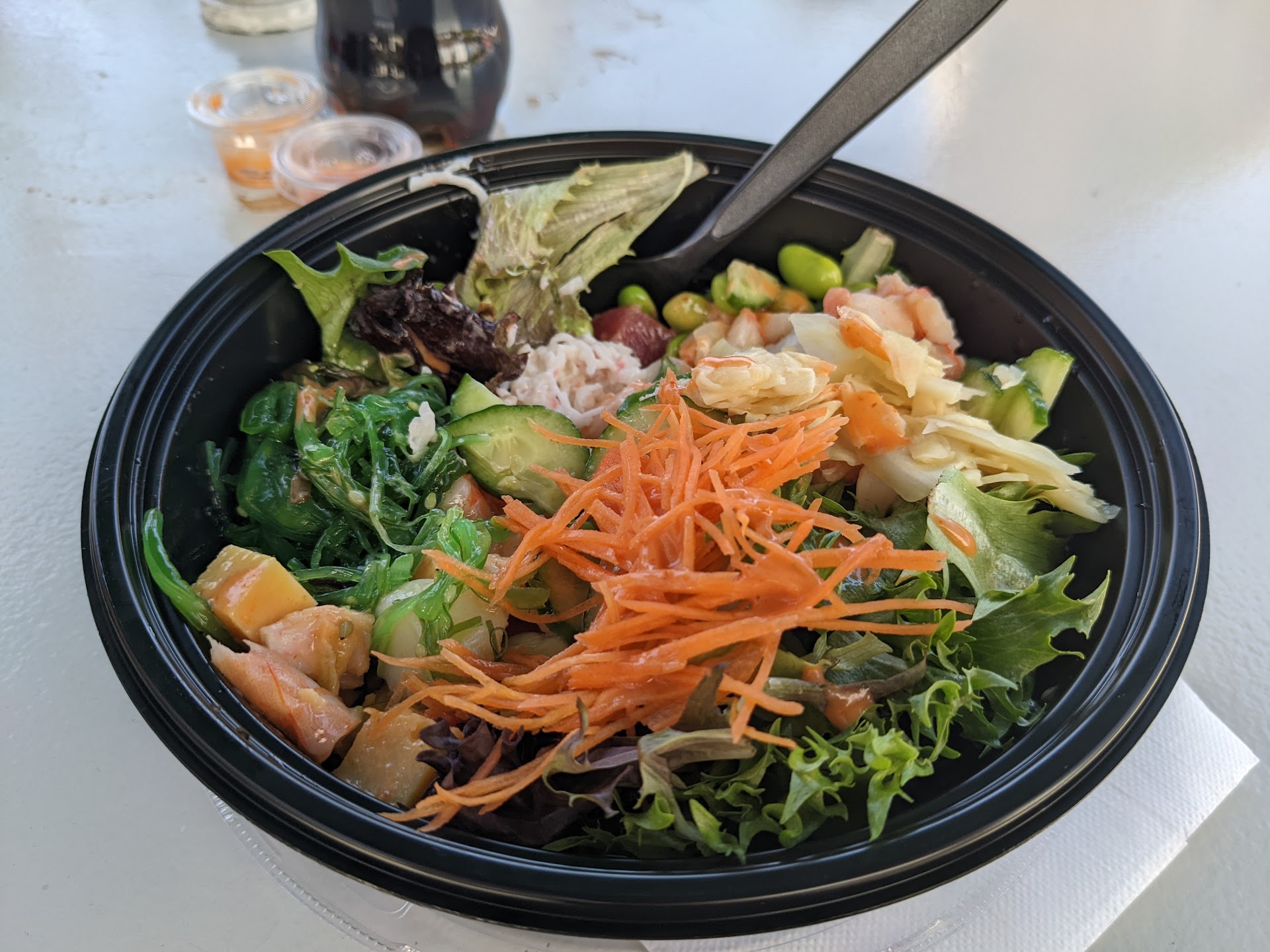 My usual order is: Regular bowl w/ brown rice, all 4 sides (cucumber, crab, avocado + extra scoop of avocado & onion), 3 scoops of fresh salmon, extra scoop of albacore, seaweed salad, carrots, green onion, topped with nori strips, furikake &...