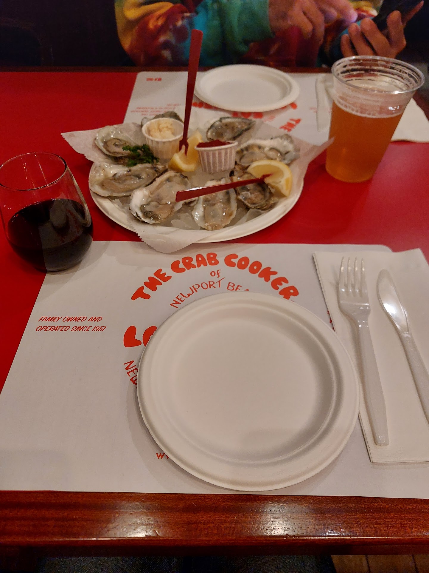 Read moreLast day of March, thank goodness they still had raw oysters. That was the best thing overall here. Dinner served on Paperplates should never be served in a dining room, unless for children or at an outdoor BBQ. Paperplates are so non-California, save the planet, less is more, reduce-reuse-recycle. Paperplates are not that cheap, do nothing to save the environment, participate in deforestation, and are just plain cheap for a nice restaurant. This restaurant would be way more classy if they used real ceramic plateware. Plastic cups for all drinks, except wine came in a small glass. Maybe the owner should go visit the landfill and see what they are causing...especially all the wind is just making the area trashy with all that blows away from garbage cans as well the dump. This is the west coast of the US. Where is the fresh wild west coast salmon? Not at this restaurant. Very disappointed that you do not offer the, true natural, five species of pacific salmon. Farmed Atlantic salmon is full of parasites and disease, not a healthy choice and is an invasion species if caught in the wild. Probably will be outlawed one day. As the side dish options, what about fresh steam vegetables, of any sort? There are so many year round farms to buy from locally, yet you "import fresh potatoes" and cook and mash them and add cheese and I don't know what else. How do we really know that these are fresh? The catch of the day was maybe a 4oz portion, Alaskan halibut, slightly overcooked. The mix seafood on a skewer was not enough food, especially for the cost. We truly expected 3 or more skewers of seafood of 3 different types...one scallop, really?!? Cheap cheap cheap. If we weren't totally starving when we arrived, we would have left. We will not recommend this place and will not be back again. Most definitely not worth the money spent. Our server was polite and nice, but it could have been a little more prompt. Also, please put on the menu the clam chowder is "Manhattan style". A table next to use was shocked when they received the red clam chowder and said nothing, just passed it around for their friends to try and didn't seem very satisfied with the red seafood chowder. This is a cheap seafood kabob restaurant with small portions, some small portions of steamed crab and deep fried crabcakes. No vegan options, no vegetarian options, no beef or...