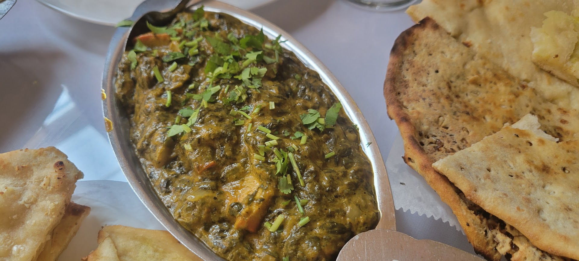 We've done a couple of pick ups from here and almost every time, the food has impressed us. When it comes to curries, they nail it, at least in vegetarian curries. We've tried Mushroom Matar, Paneer Mushroom Bhuna, Saag Paneer and Dal Makhani and they all were great. They're known for Saag Paneer but they're good with the rest as well. For Indians - if you're looking for Indian level of spiciness, just ensure you give 10/10 on spice level while ordering - which is kind of moderate spicy for Indians. The exception will be Paneer Mushroom Bhuna which was exceptionally spicy at 10/10 but we still loved it. When it comes to flatbread, that's where the choices are limited. We tried their Kashmiri Naan, Garlic Naan, Paratha, Aloo Paratha, Aloo Naan and Onion Naan. I'd definitely go for Garlic Naan, Onion Naan or Aloo Paratha on any day. Wasn't really impressed with the rest. Vegetable Samosa was okay. They're very generous with the rice that comes along with the curries. A little more than necessary for even two people. We once just refused rice to avoid wastage since there's no point throwing away the food. Having said that, the quality of rice is great. The ambiance seems to be good. It's a small restaurant in terms of dining in since majority of their business, I believe, comes from deliveries and takeouts. But there are a few tables inside the restaurant for about 20 people. Service, at least in takeaways, is pretty quick. Post order, it's ready in about 10mins. I haven't had much interaction with the staff but it's been good, whatever little. Overall, great place for some delicious Indian food,...