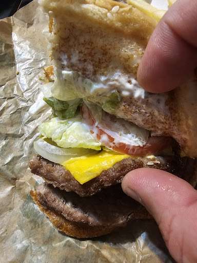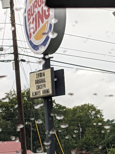 Disappointing experience. My husband and I decided to go get a juicy whopper Jr for supper. We pulled into the parking lot just before 8 pm on a Saturday night and there were no customers in the restaurant. This should have been a sign when all the restaurants we passed we packed. I'm not sure what's going on with the menu. There are 2 screens and 1 has all drinks and desserts. The other kept rotating to specials. I didn't see anywhere that had combo numbers with prices and choices. I told my husband well I know they have whopper Jr's just not seeing them. When we got to the counter there was a dirty paper menu taped to the counter but no prices. We ordered 2 whopper Jr combos (so they do have them) with large onion rings and no onions on 1 of the whopper Jr's. By the time my husband ran his credit card and we got our cups and were headed to get our drinks the cashier sat our food on the counter and called us over as we were still at the counter so food was not fresh and with no customers hard telling how long it had been there. No one dining in and just a couple in drive thru. Told husband that was fast....too fast. Got drinks from grubby looking counter area. Opened sandwiches to figure out which one didn't have onions. Attendant had points out but forgot. One had 3 hald pieces the other had 1. Paper wrap looked like it had been opened onion taken off and rewrapped. Burgers cold and no sauce to speak of and a couple of hard white lettuce clumps. Had to get ketchup to add to make it edible. 2 large onion rings slightly warm and left over. 2 different batches and not cooking consistently because some were cooked to the right color and cold and others very pale color and slightly warm. Wish I hadn't wasted my money and had a better night out. I hadn't been in a long time due to the last time I had been there food was just ok but dine in not good do to raining and buckets were everywhere. Seems to have roof fixed as had been raining Sat and dining area was dry. Empty but dry. The whole time we ate only saw a few more people come in. Not very good for a Sat evening. Someone needs to straighten that store out. Would love to have a great Burger...