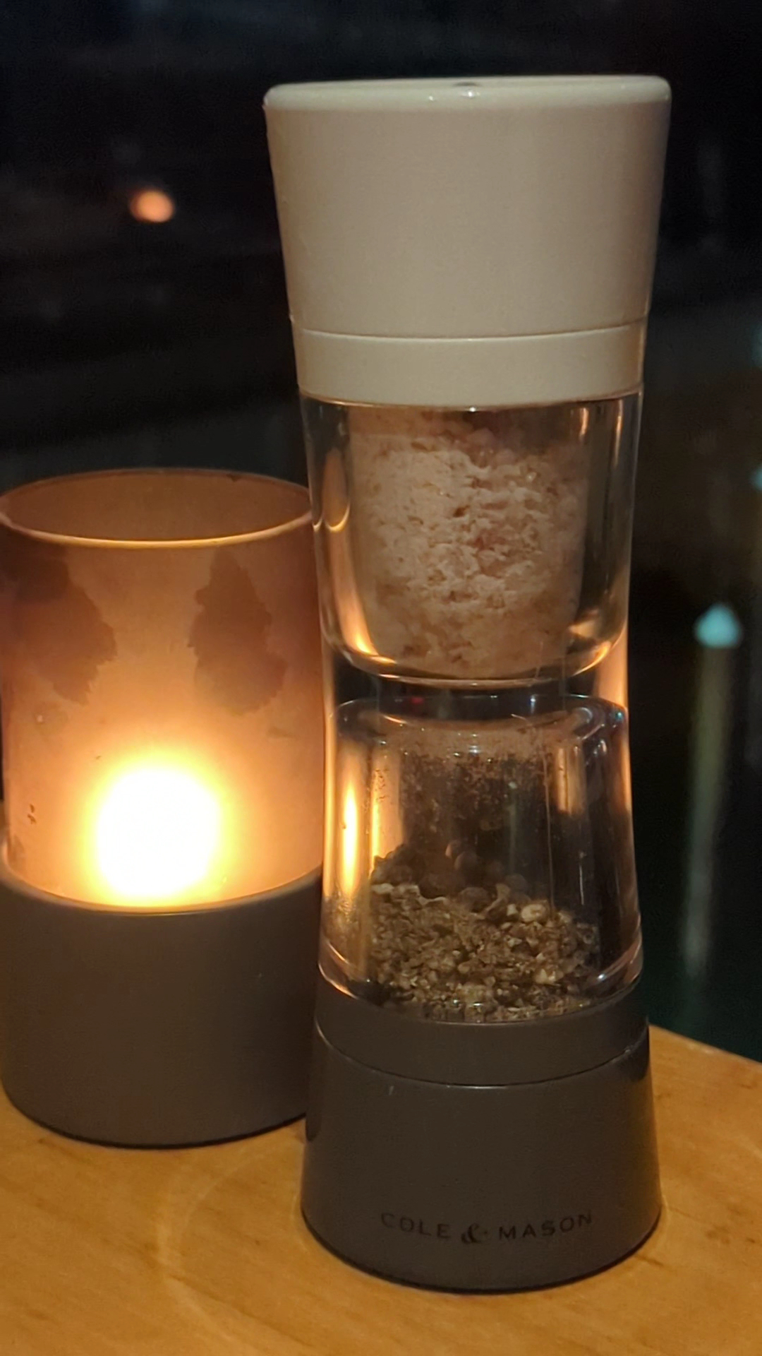 After sunset, I went to the restaurant and enjoyed the warm lighting that filled the walls. It provided just enough light to feel cozy. Each table had a candle and salt and pepper shaker that added just the right amount of glow. I was seated upstairs towards the right of the bar near a window, which gave me a clear view of sea lions swimming in the bay.