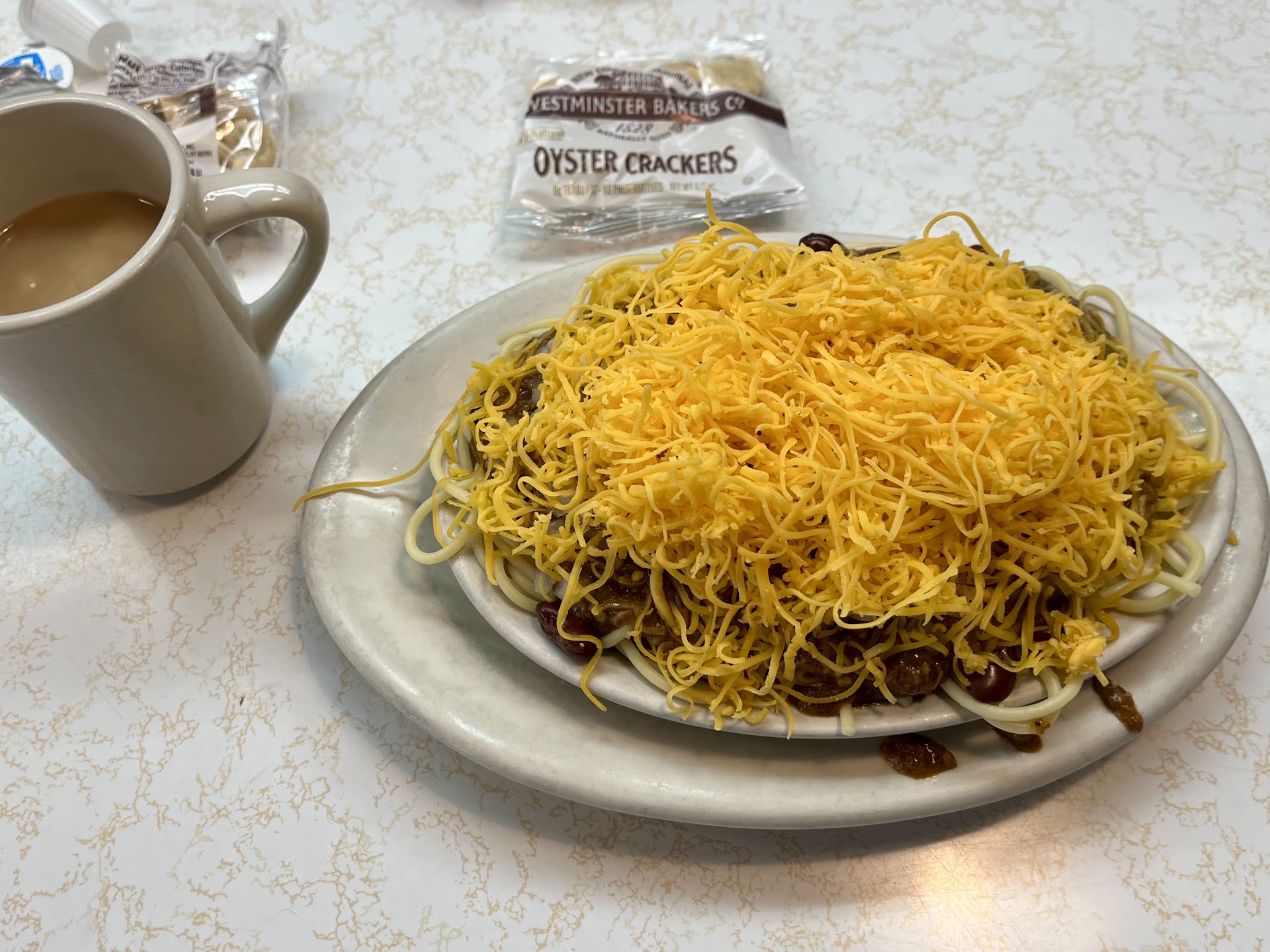 The medium-sized five-way (they have three sizes) was $8.85, which is a great price in this economy. (Not more than Skyline’s price for the five-way pre-COVID and pre-inflation.) The cup of coffee with continuous refills was $2.50. Cash only, so make sure you have bills with you. (They do also have an ATM right inside the front door.)
