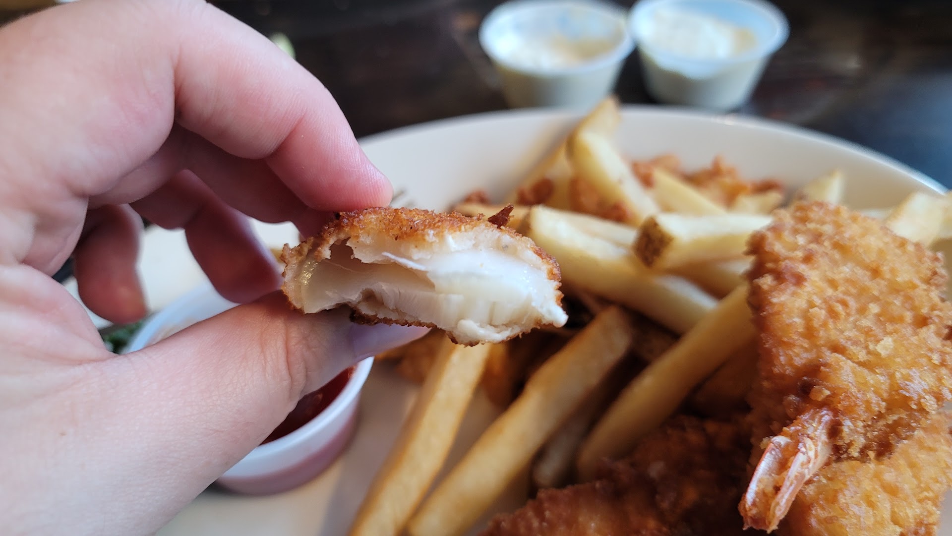 The food overall was better than my first visit here a year ago. I got the combination plate with fried halibut, shrimp and clam strips, it also came with chowder. My mother got the fish and chips plate with a bay shrimp salad. She did not comment on the salad but ate most of it. She enjoyed her fish. I liked the meal but it was lacking some. What I really liked about the halibut was that it did not have a thick layer of fried batter. It was crispy and the fish was flakey. I do feel the batter could of used some seasoning to take it one notch closer to perfection. The shrimp was good and tasted like your typical fried shrimp. The clam strips didn't seem to have a whole lot of flavor to it. As for the condiments.....the tartar sauce was horrible, neither of us ate it. It had a major strong onion flavor which I have never tasted in a tartar sauce before and it really over powered everything. The cocktail sauce was not the best I have had but was definitely better than the tartar sauce. The clam chowder was decent but not nearly great. Not sure what it is, but I have yet to find really great chowder in Oregon. I'm also not used to the whole putting a dab of butter on top. It seems chowder really does taste different from state to state. Some of the best chowder I have had was in San Francisco and Pismo California. The service was ok, I would give the service 3.5 stars if I could. We weren't checked on once we got our food until we finished and then was asked if we wanted dessert, we chose not to have dessert here.