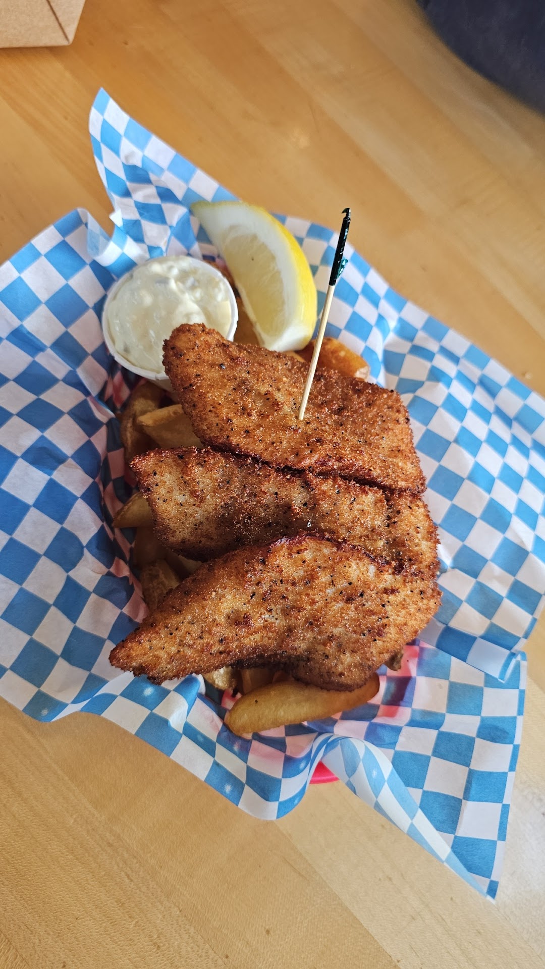 Off the hook restaurant was a good place to eat. There was one waiter in 1 waitress that I could see in they seemed very busy. The guy who helped us was very helpful. We started with crab cakes. They tasted good, not super good, just good. I did get some pieces of shell or something very hard in mine. The housemaid tartar sauce tastes like Dill relish and mayo to me. It's not bad it's just standard. I had the Ruby's pork Mac and cheese. It was good a little bland the noodles were cooked nicely, not too much cheese sauce and the pork was okay on top. I can't complain about it. It was a little better than standard. I feel like kids would love this dish. You can get it with or without the barbecue sauce on the pork. Next, I had the halibut fish and chips. The chips that come with this meal are awesome. The halibut is not worth the $26.99. I feel it was slightly overcooked. The fish was dry. I have definitely had worse, and yes, I would try this again. We did have a small mishap. The end of the ketchup squeezy tube popped off when we were trying to get ketchup on our plate, and we ended up with most of the bottle on our plate. Last but not least, we had the patty melt messy and delicious. This was served with the same chips or fries that come with the halibut. And they are delicious. I definitely would not shy away from stopping here and trying Off The Hook. The parking lot is a...