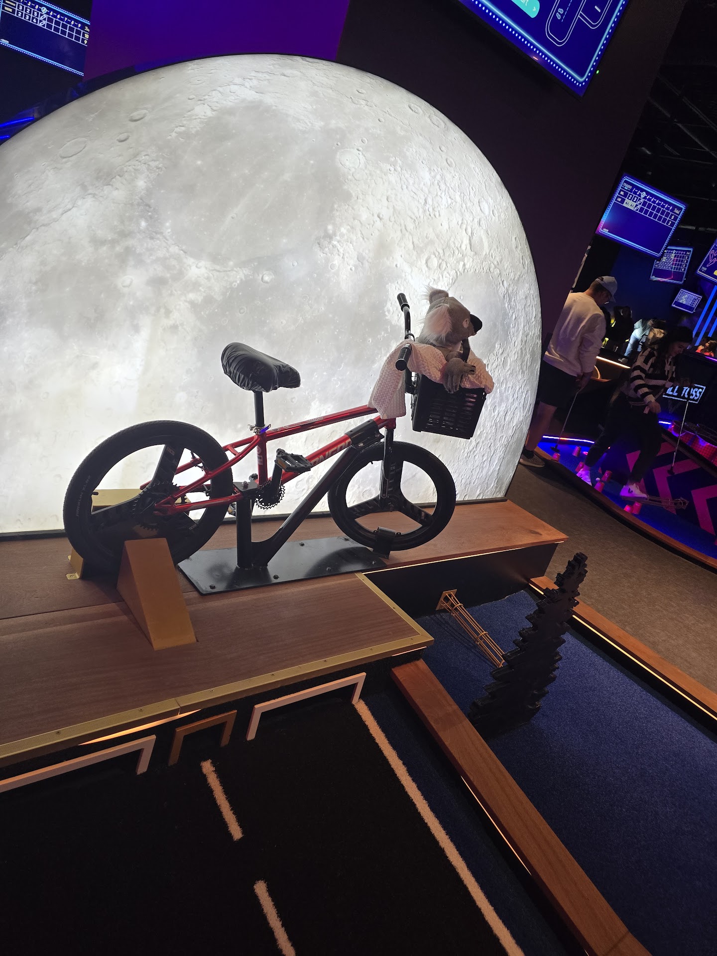 Upon arrival, you head upstairs to choose how many courses you want to play and how many people are in your group. There are three distinct themed courses—Eagle, Birdie, and Ace—each offering a unique vibe and challenges: