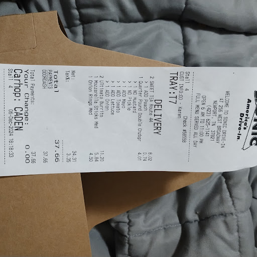 Read moreI've been here about 3 times now, the first, the carhop was taking food and drinks out (randomly). Many of us had to get up and go to the door. Took 40 mins and my order was still wrong. I ended up leaving and a few others did as well. Second time the order was correct and the food was GREAT! Went back again last night and the car hop (blue hair) didn't even greet us. Didn't say anything just started passing food and drinks. I handed her a tip and she was still silent. I think she said bye, nothing else. I used to work for sonic (in a different state) and I would never be rude to customers like that. My tips depended on it. The food this time was EXTREMELY dry (like it had been held a while) popcorn chicken. And my $3 garlic burger was not great (soggy) and my onion rings all had the batter pulled off/not attached to the onion. I love the ice but will...
