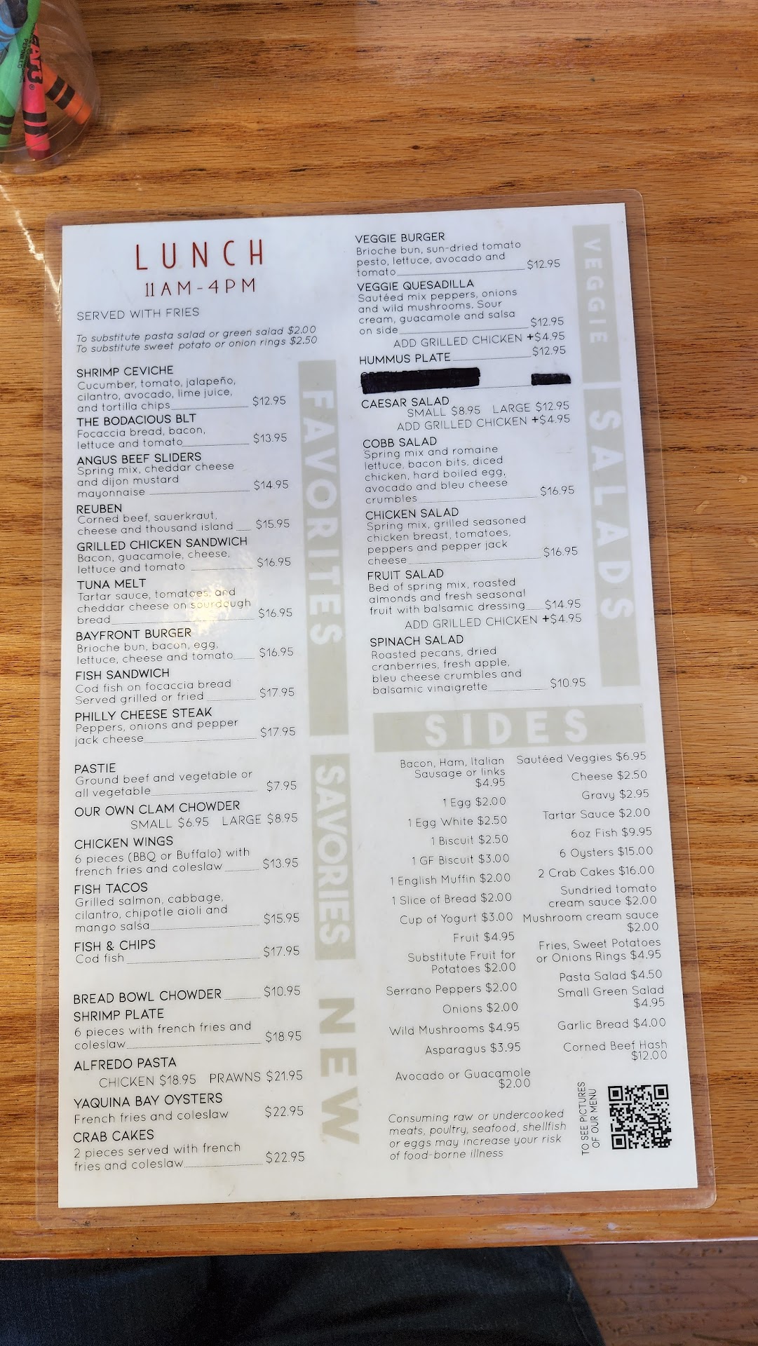 Cozy little coffee house and café located on the Bayfront with a full bar, a small but decent selection of draft beers and an excellent wine flight. Perfectly oriented to have a warm meal and a drink while you watch the fishing fleet come in and out. Limited indoor and outdoor seating; I have a feeling this place fills up quick. The indoor seating is sectioned off by clear vinyl sheeting to provide for a little better separation from the other guests. Parking is ample although this is the Bayfront and you might have a bit of a walk.t