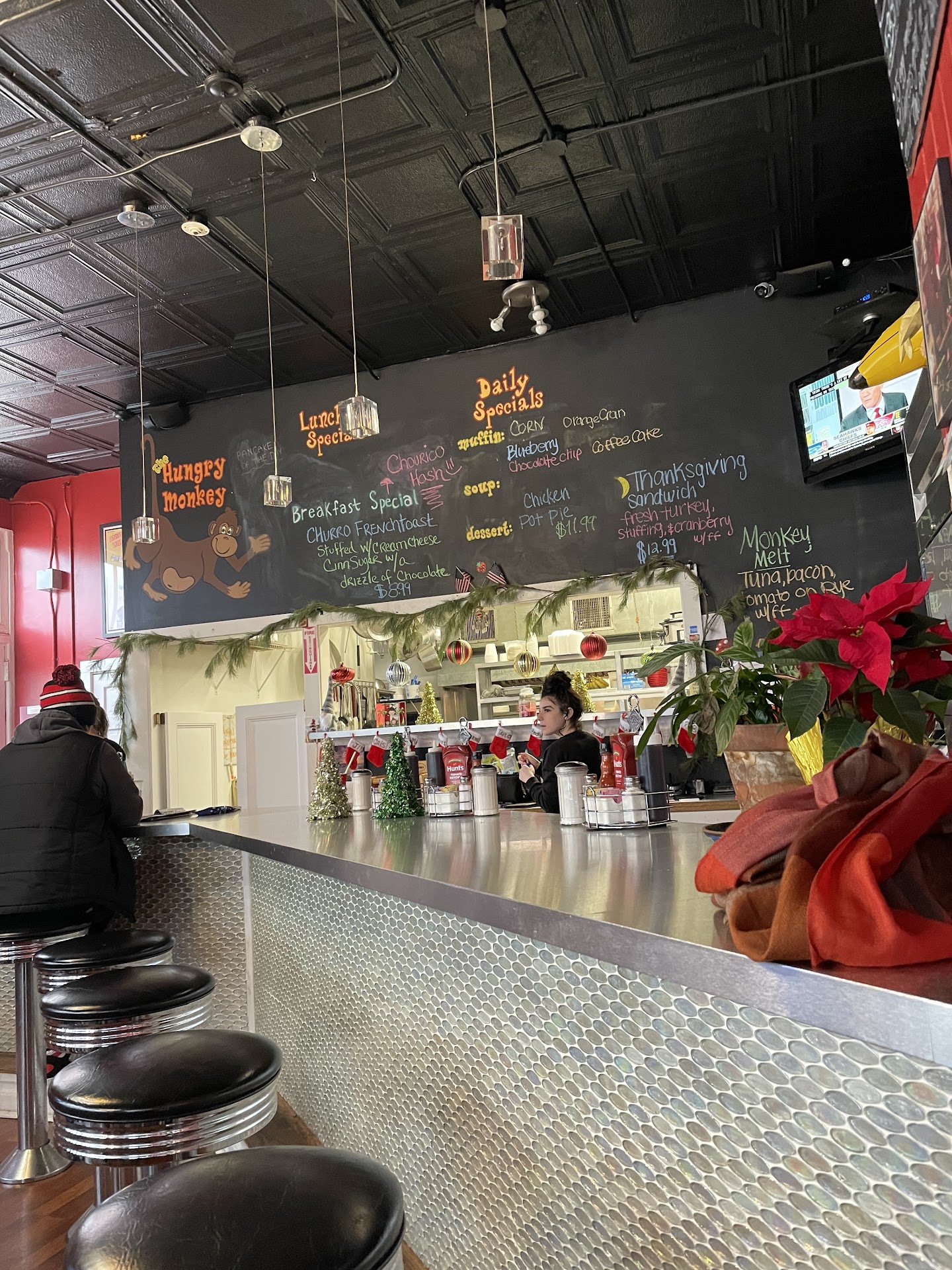 We walked to the Corner Corner and were told it would be a 45 minute wait there. Okay, not waiting 45 minutes for breakfast, so we'll go to this place next door called the Hungry Monkey! As soon as we walked in, we should have known we were in for trouble. The hostess was helping bus tables and would come back to the hostess stand to make a phone call and then walk away again. We were standing at the hostess stand for probably 5 minutes and she never once acknowledged our existence. We finally asked another waitress if we could just sit at the counter.