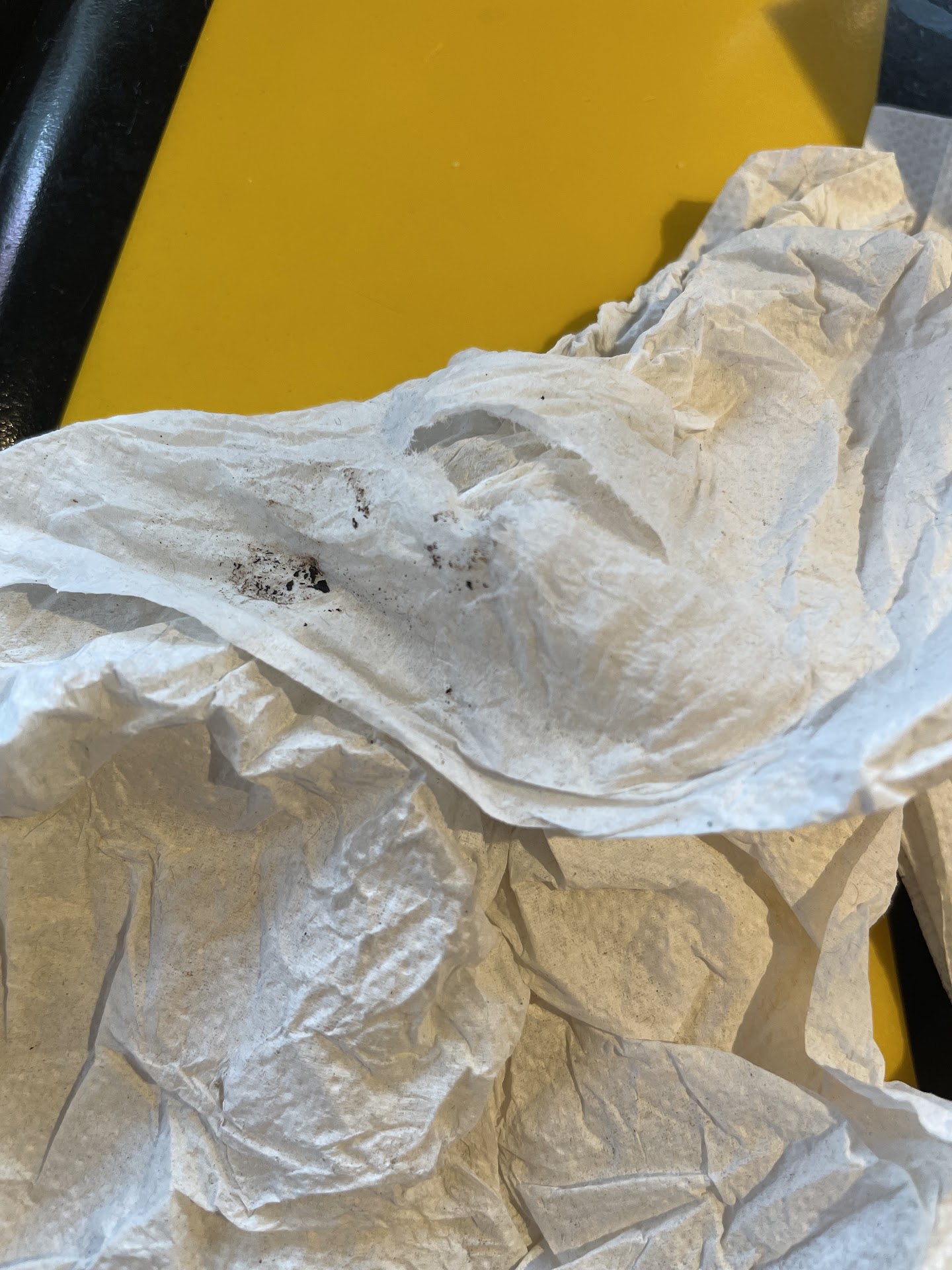 So then I go to get a drink. I choose the Sobe Lifewater. Imagine my surprise to find black flecks of something in it. There's no juice, so I knew that didn't belong. Again, I worked fast food for four years, so I knew what it was. I took off the nozzle and wiped the inside with a napkin. The picture is what I found (there's more than one spot on the napkin). That's mold. Imagine if I'd gotten a dark soda and not known what I was drinking. Nozzles should be cleaned at least twice daily. There's no way they'd been done recently since mold takes more than a couple of hours to grow. I told a kid who worked there who promptly went on break without telling anyone what I'd told him. So then I told the woman who brought us our food. Hopefully she or someone else went to clean them, but since they're in another part of the restaurant of where we sat, I have no way of knowing.