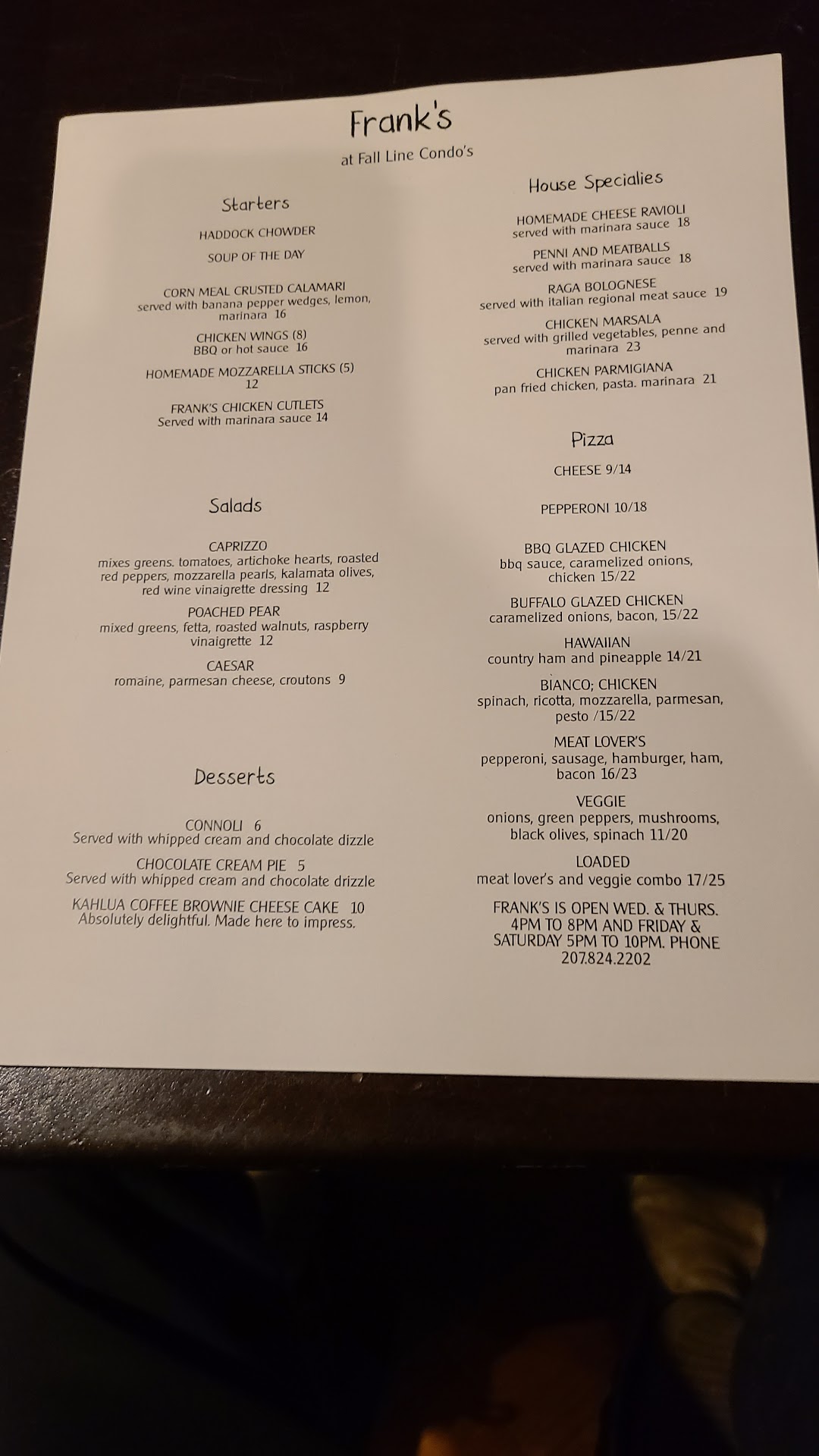 Read moreIf you are looking for a nice, personal service and a well cooked Italian meal (slope side!) then definitely hit up Frank’s at the Fall Line Condos. The restaurant is on the 2nd floor of the condo complex and parking is free and ample. There are multiple fireplaces, a pool table and the owner, Frank, is a great conversationalist and active in...