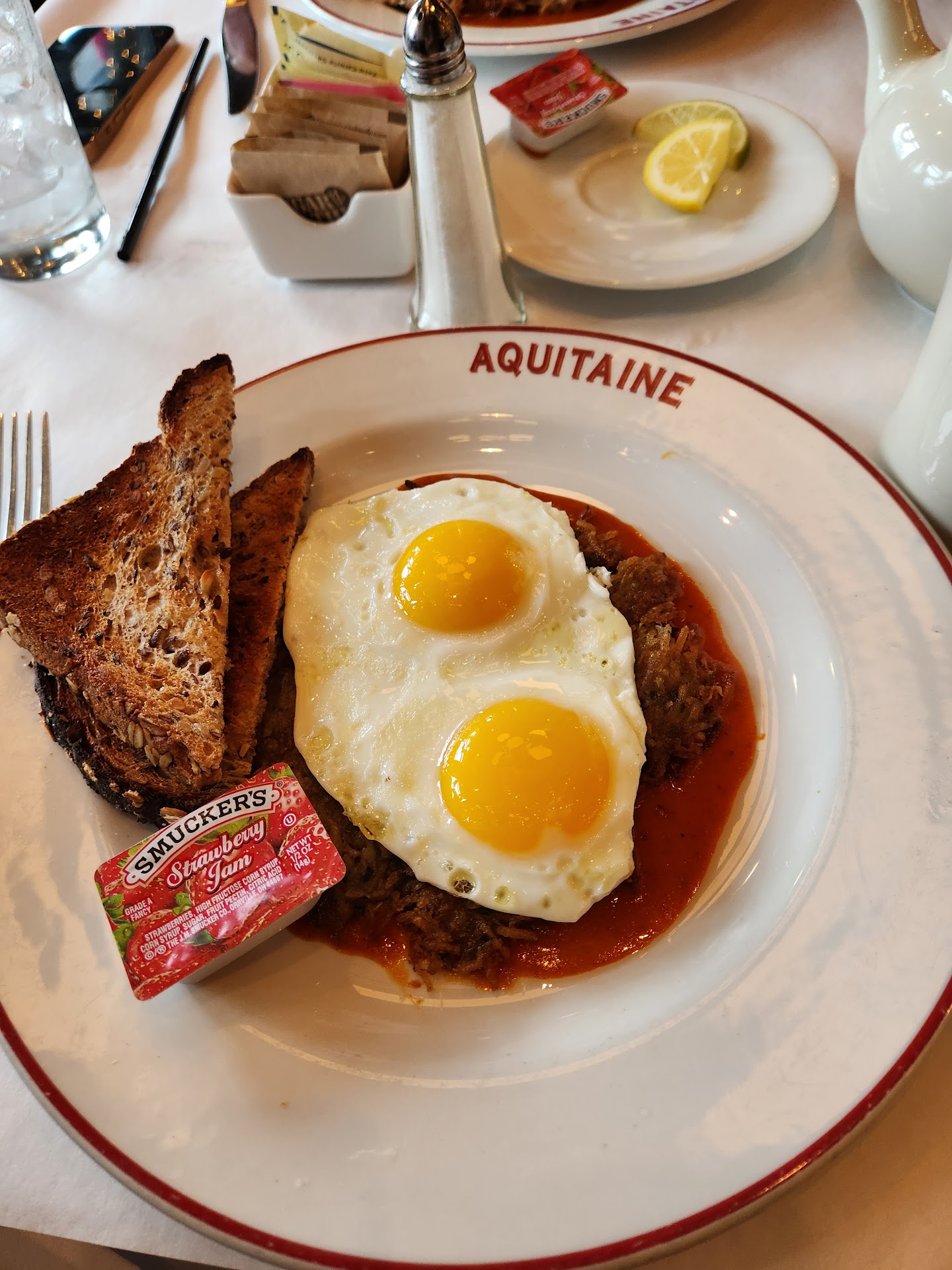 Read moreIf this was based just on my meal I would have given Aquitaine at least five stars. I'll explain why it's slightly less than that. The appetizers were excellent absolutely outstanding the duck Pate was fantastic. The only thing I would have done is maybe a little bit more of the toast points I believe it's called. My endive salad was excellent really enjoyed the blue cheese. For my main I had the beef which was outstanding absolutely fantastic. Richard had the veal schnitzel which definitely was overcooked still had flavor but it was overcooked because it's pounded very very thin you have to pay very close attention to that. Sharon had the herb chicken breast which is very good not quite excellent but still very good. The one big letdown in my impression was the dessert they did not have the pain Purdue I'm probably spelling that wrong it's kind of like we kiddingly call adult French toast it's made with a brioche bread and it is absolutely fantastic and was not on the menu which is such a shame please get that back on the menu cuz I'll tell you that's kind of one of the things I look forward.overall I was very happy and I would definitely not have a problem coming back price is definitely have gone up in the year that it's been since we've been there but well you know unfortunately you got to start recouping some of the losses that all of us in the food industry have had including us because we have a food service business ourselves and we sympathize with what's...