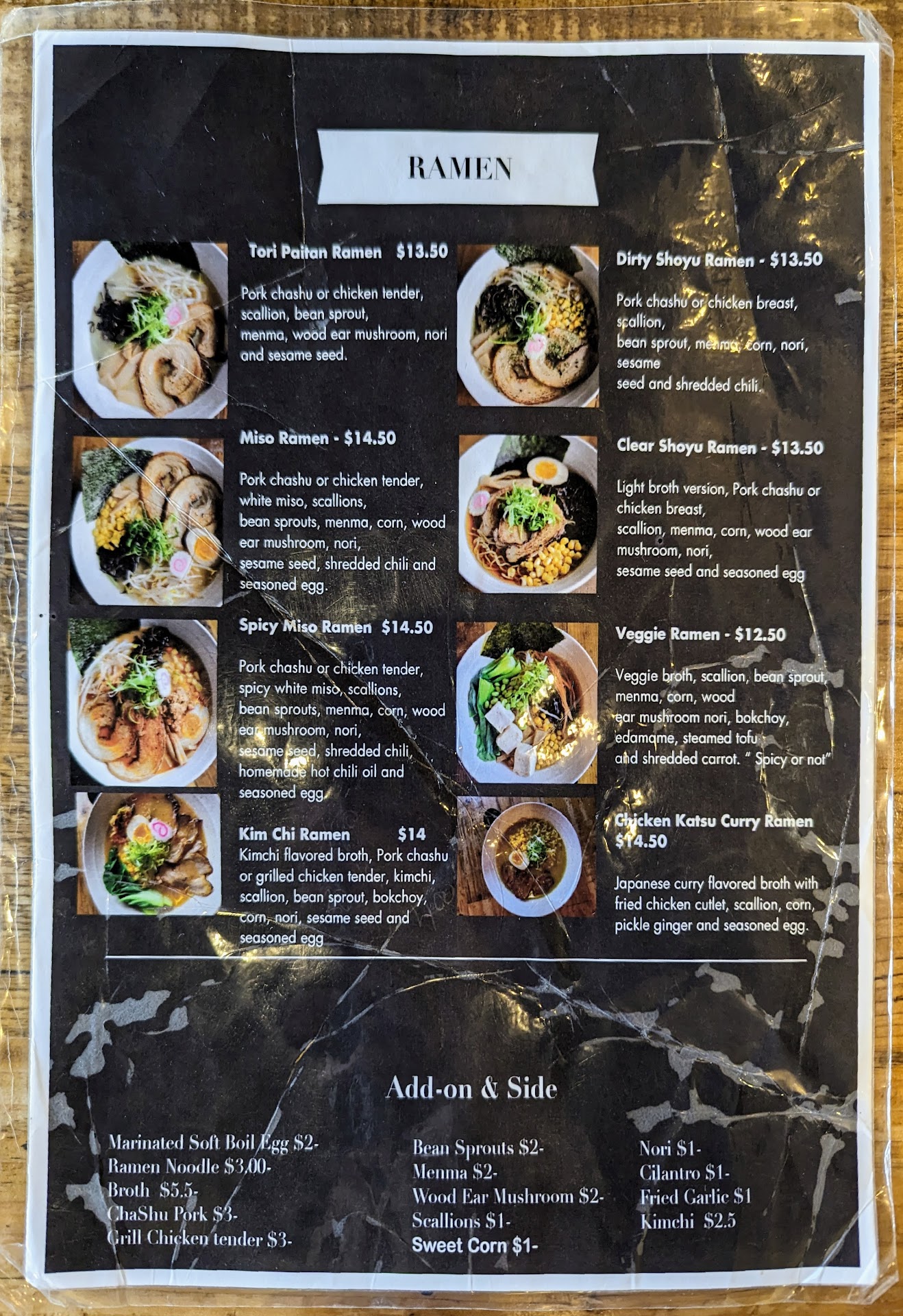 I sampled both the curry ramen and spicy miso broths, which tasted good but not exceptional. I'm unsure if I'd return, but if I did, I might opt for the shoyu ramen, although I wasn't a fan of the protein choices. They offer a nice selection of beverages, and the service is good, managing to fit a good number of tables in the small space.