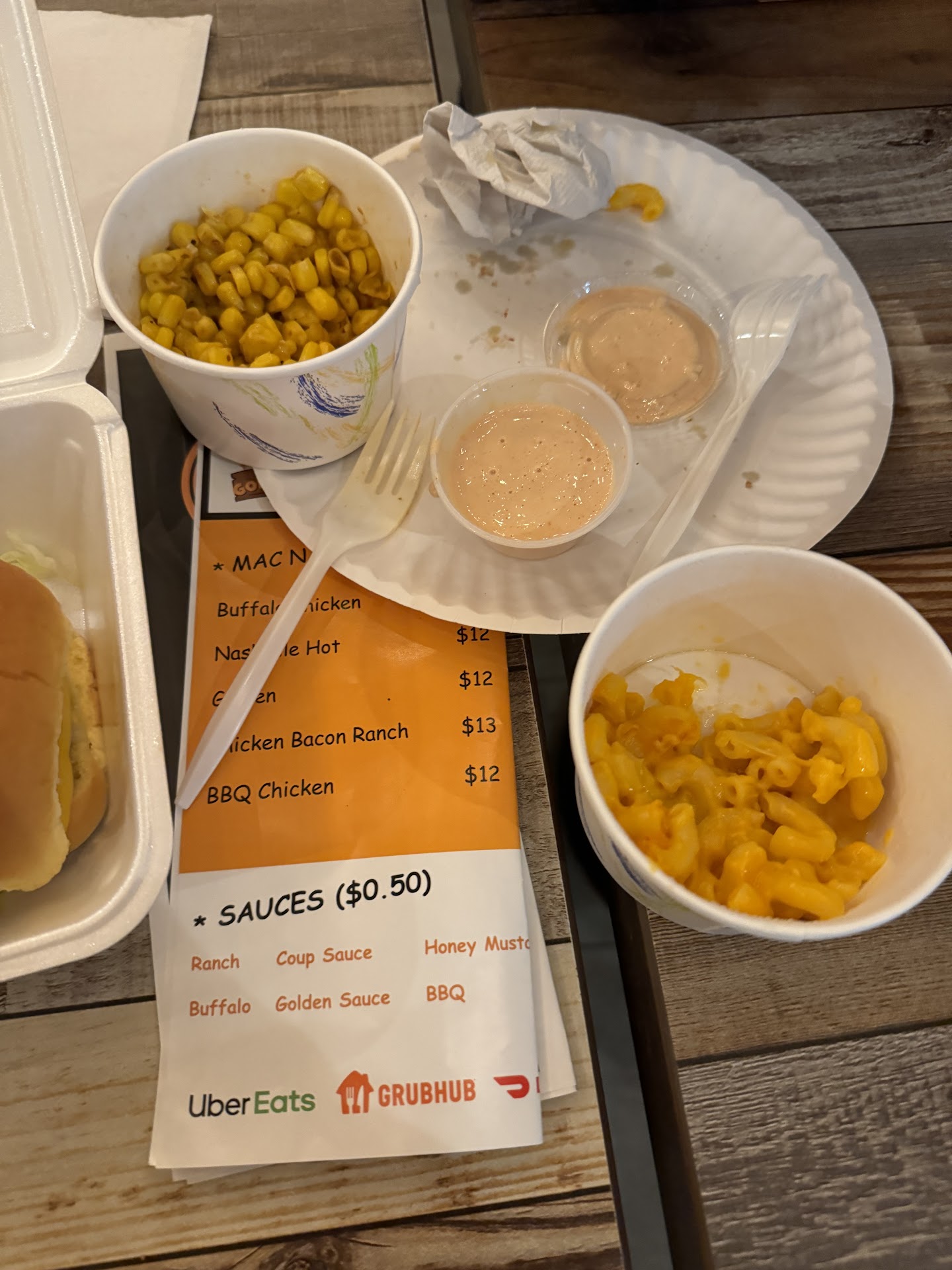 Read moreBest fried chicken Sandwhich and I got the COUP sauce and ordered deluxe ! I got Mac & cheez and I is so thick and good the corn has black pepper in it and so tasty ! 20 bucks for two sliders and two small apps! I also got a slice of pepperoni pizza because why not I was at...