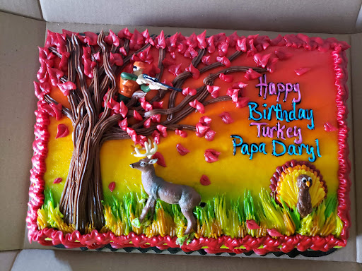 I'd rate it a 5 except for the lady who confirmed my order was rude. Celebrated my daddy's birthday when we were home one full day this last week. A little late, but better than never. Paiz and Brooklynn came up with the idea, and the cake design. Paiz called me and said "Grandma Di, PaPa Daryl did not get a cake for his Birthday. Only a KFC cake. We need to get him a cake." I asked her okay what do you want to do? She said "I want a man hunting in a tree, with a gun, deer on the ground and red leaves." I said wow you have really thought about it. She said yep. I asked what does Mae Mae want and Mae Mae said Blue, pink, and Turkey. So after all this I called Hyvee and ordered the cake. (The only place we go) The lady who called to confirm the order was rude and acted as if she did not want me to order it. Saying things like well that is a lot on that cake, I said okay I can order a bigger one. She said that is not what I am saying. I said alright so what?she goes well (in a rude voice) it will look cartoonish. I said it is okay by this time getting upset because of how I am being treated, they are just going to eat the damn thing and my two granddaughters came up with the whole idea. She must have noticed because she then said well I'll just put the order in then. I said good. Anyway I know two ladies at Hyvee who always do amazing work and one is Amy Carlson Cunningham. I just wanted give her a shout out and say A JOB WELL DONE! The two grandkids loved it and it tasted great! Thanks again to...
