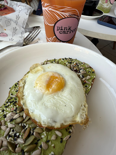 Read moreI was very much looking forward to having lunch at Pink Carrot with a friend. We ordered and spoke the employee at the register and asked him if he could please turn down the extremely loud music. He did. We went to our table and the food was served very soon after, and as soon as we sat down the music was blasted once again. I ordered the chicken pesto sandwich and my friend ordered the bean burger. They were both extremely bland- Mine had sticky tasteless cheese. The concept was good, but the flavor empty. My friend asked again for the music to be turned down as we could barely hear each other at our small table. He turned it down again and that seconds later it was back blaring. This is our last time at Pink Carrot. The 3 stars above represent our thanks to the lovely woman who was clearing and...