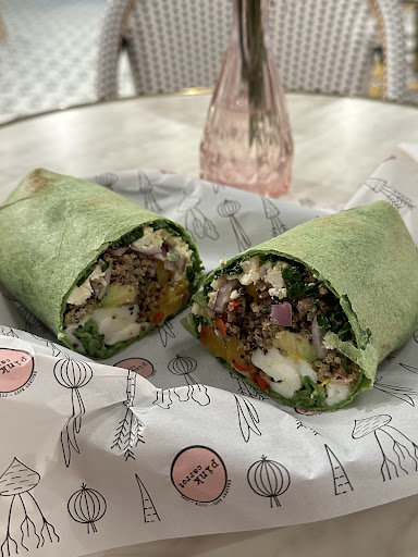The menu is varied and has a healthier feel, with salads for all tastes, wraps, burgers... but I always order a salad that I love here called "Mama Bird," which is a mixture of greens, apples, and seeds that is divinely delicious. My friend ordered a turkey burger, which is very filling, and said it was delicious. To drink, I ordered a smoothie called Strawberry Glow (it has collagen, which I love and want Lol) and she ordered a ginger and turmeric juice. Everything was great.