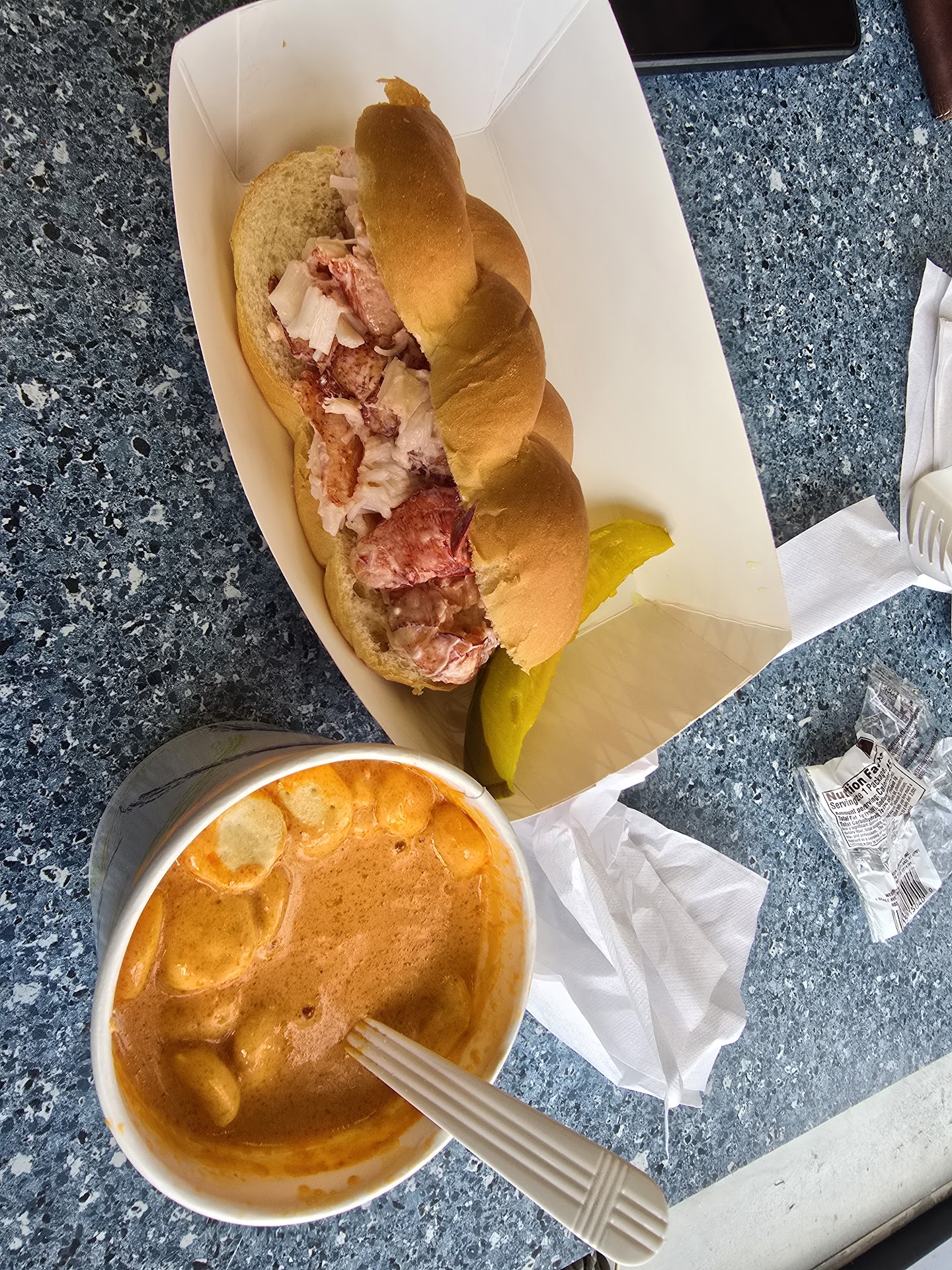 Lobster roll didnt have a ton of lobster like I have seen before but it was still good. The roll it was on was a little more firm of a bread. Not a lobster roll pro by any means just not what I remember these sandwiches being like. Came with a pickle spear which added to the flavor. Was good overall.