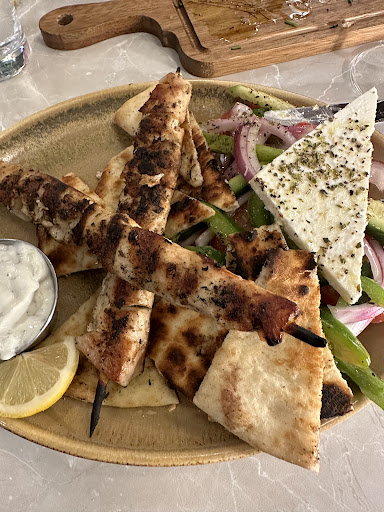 There is a full bar with lots of wine choices. I had the Greek red and it was very good. We really enjoyed the appetizer of the spreads (hummus, baba, and tzatziki ). The pita was warm and grilled. 4 of us shared it and it was a nice start. We also had an order of the grilled chicken wings, which were charbroiled and very tasty. The feta fries, though good, weren’t what we were expecting. But we ate them all anyway! All of the entrees with grilled toppings were excellent. The grilled shrimp , grilled salmon and grilled chicken souvlaki were delicious. The Greek salad was amazing. Everything was very fresh and tasty. The restaurant had only been open a month but it felt like they were there forever. The place was packed but we were served in a timely fashion and courses were paced well. The deserts were excellent. We had the baklava and the chocolate torte with ice cream. Such a great ending. Noise level was very high at the beginning. Hard to have a conversation but we were told there would be sound abatement soon. Once the restaurant cleared out a little, it was better. The owners worked the crowd and made you feel like family. We definitely plan to go back. You could have a full three course meal or just go in for a burger and fries or a pizza. Next time I want to try the pizza. It looked...