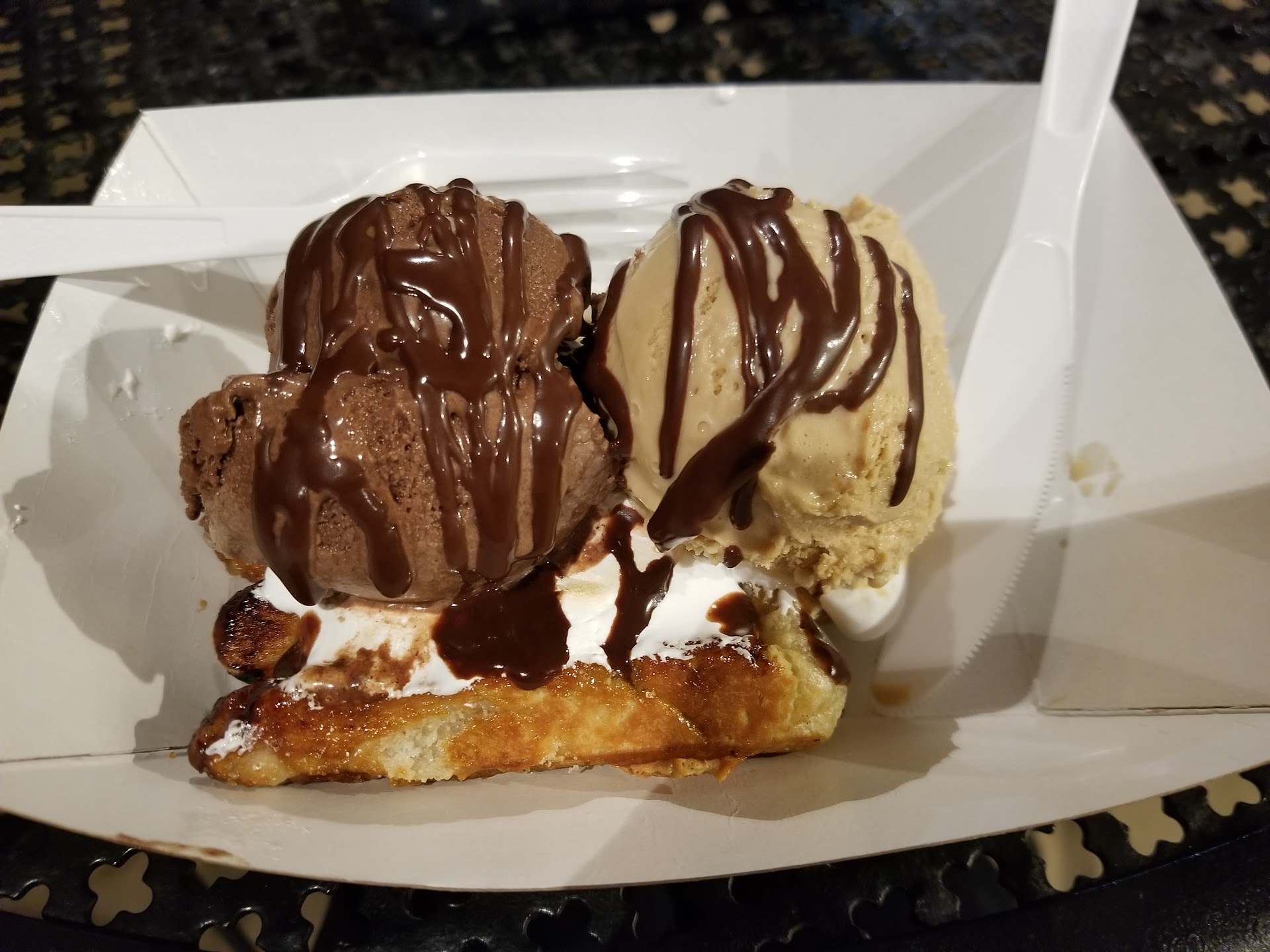 Now let me tell you about the negatives. Cliff Notes version - literally everything else. First, you are given a knife and a spork. A spork doesn’t let your grip the waffle and more than one patron asked for another spork because it broke. The hot fudge aka chocolate ganache was not fudgy, but it was absolutely hot because it burnt my throat all the day down to my stomach. I’d talk about the whipped cream and cherries but there were none. Ok, for the pièce de résistance - the waffle. What can I say other than the waffle was terrible. I’ve honestly had better Eggo Waffles. The waffle taste was not great, maybe malt, overpowering and the consistency was heavy. I couldn’t even finish it.
