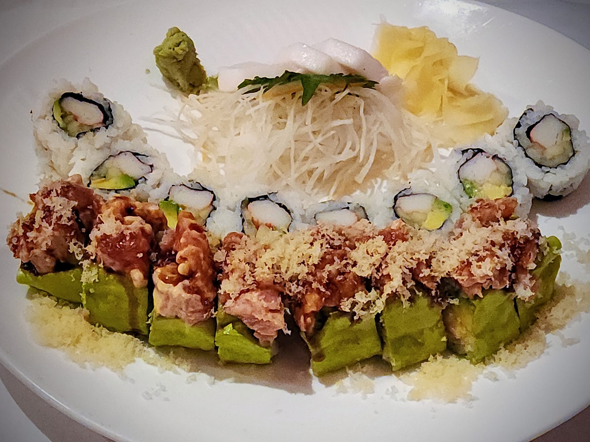 My wife's roll was overly cold, suggesting it might have been made ahead of time. A couple of my nigiri pieces were rather tough, though the white tuna, in particular, was excellent. I also liked my spicy tuna roll quite a bit. It was basically a rice roll with a heap of spicy tuna on top, which I thought was cool. I didn't like not being able to see the sushi chef(s), though. That's not typical.