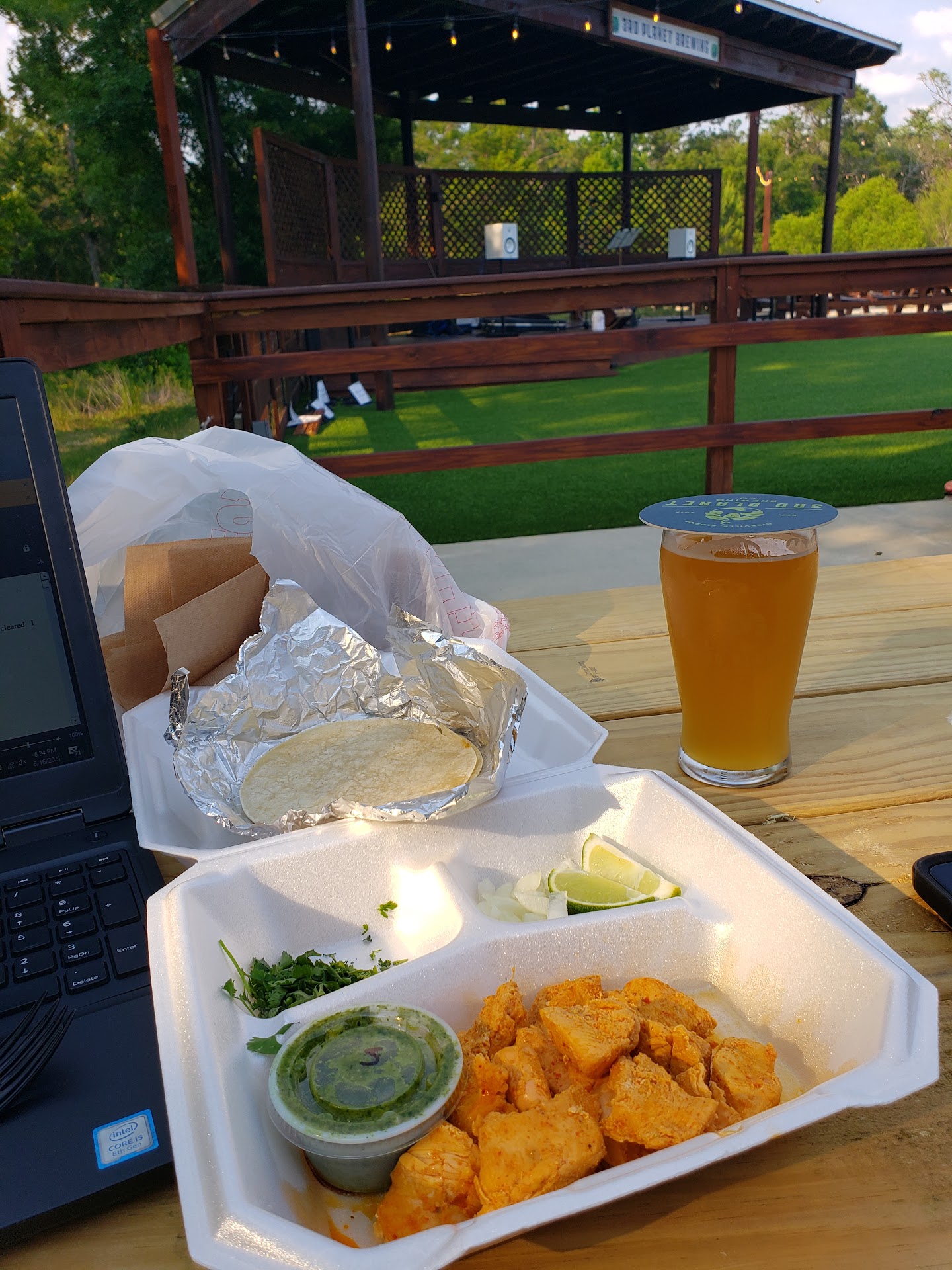 What a great place for a quick drink after work. We came for Eagles night and it was wonderful! It was great seeing locals playing some great music. They have tons of choices for beer! Some they brew themselves. They have loads of choices-- even for the non-beer drinker like me. The out door seating area is really great! They do not allow smoking on the deck, so that was a high plus for me. They do have a smoking area, too. Pets and children are allowed. Love that well behaved dogs are allowed! It definitely makes it a more friendly atmosphere. Even though they dont have a kitchen, they have local food trucks. They are delicious! It was fun to have some great choices to go with our beer.the servers took great care of us throughout the night! The bathrooms are super...