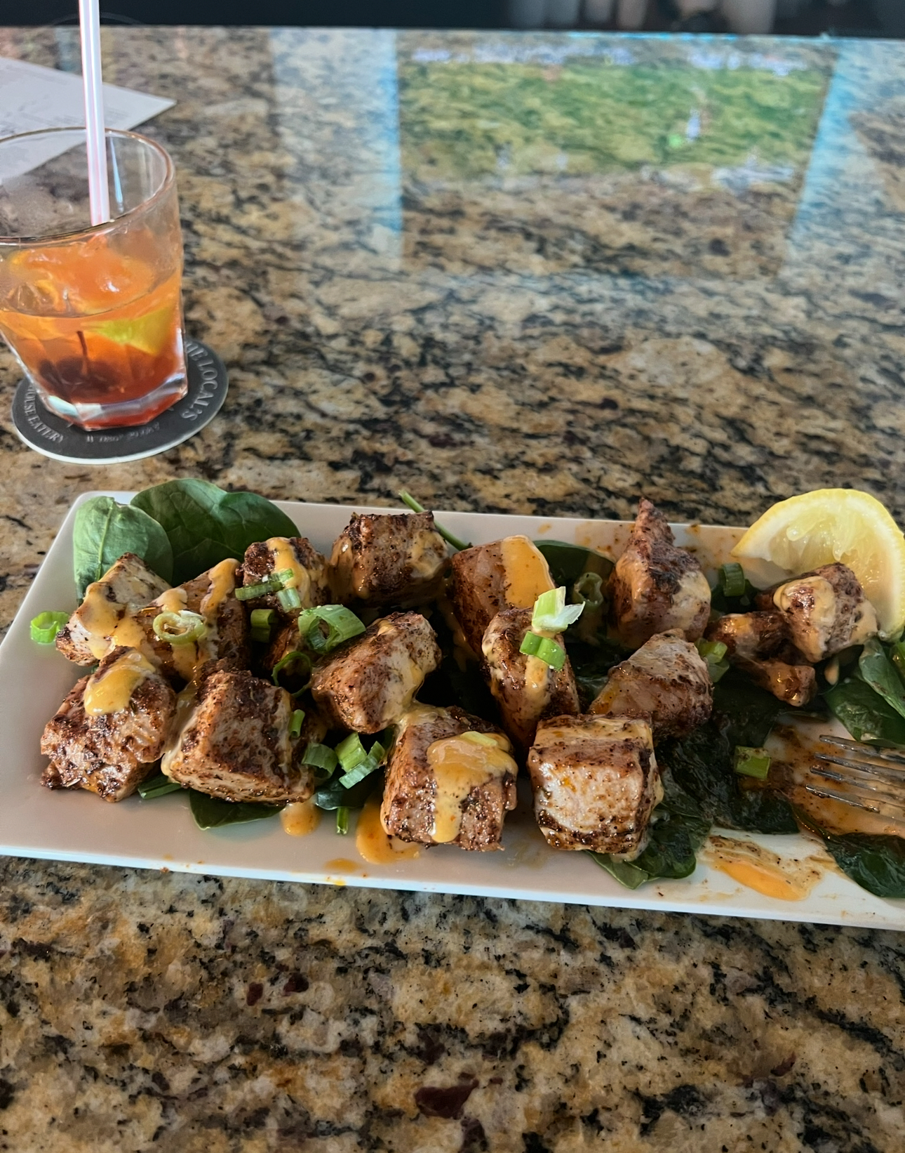 Read moreThe Locals hostesses greeted us kindly & informed us of our 30min. wait for lunch on a workday of a Tuesday around noon. We waited outside in the lovely weather staring across the docked boats at the marina watching guests dine at the coveted outdoor seating area. After our wait, we were seated indoors near open "garage doors" facing the outdoor covered eatery. We had half & half sweet tea which was JUST right in proportion for us (Although, neither of us ever places ice in our beverages). As an appetizer, we enjoyed warm pita bread sliced in typical triangular fashion with some smoked tuna (It was "ok", but wr have had better on 30A). For lunch entrée I had grilled Copia (fish) while he had Portobello Mushrooms topped with a crab stuffing. Both entrées were fine. Our biggest 2 regrets were, nit having specifically asked for outdoor seating and in nit getting their sooner in their lunch hour for the day. Maybe, next visit we can arrive sooner in the day to ask for outdoor seating. All in all, it was a good visit but bcz. it was my first visit with my husband during a lunch workday, it felt a bit rushed and not as relaxing as I had expected with bayside views. Maybe the hostess can begin asking arrivals, if it is their FIRST visit and save certain outdoors seating for a "newcomer" (ie: I). The locals already enjoy the views and can "make way" for newcomers to...